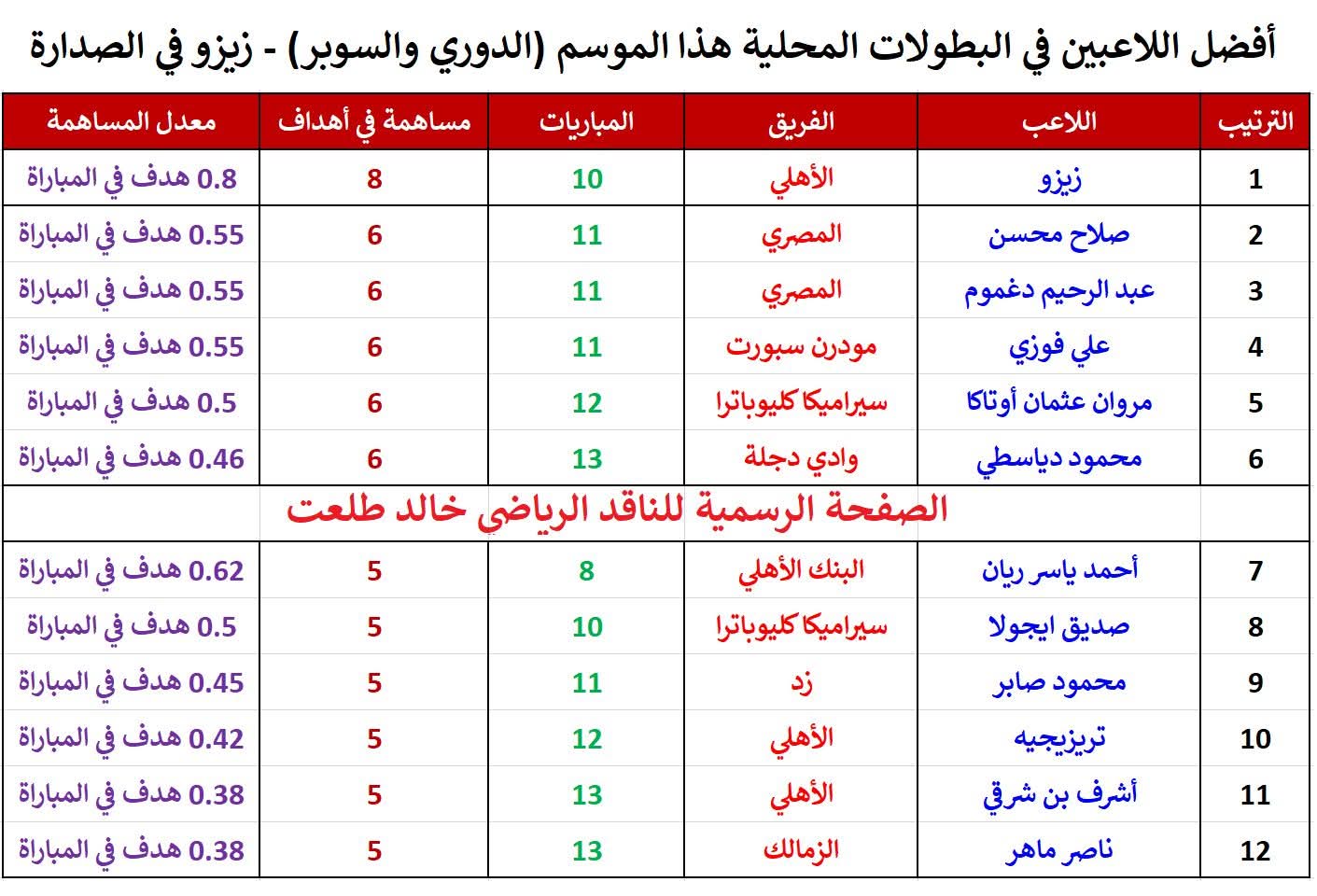 وكتب خالد طلعت عبر صفحته على موقع التواصل الاجتماعي فيسبوك:"بالأرقام .. زيزو أفضل لاعب في مصر هذا الموسم في كل البطولات المحلية (الدوري وكأس السوبر)".