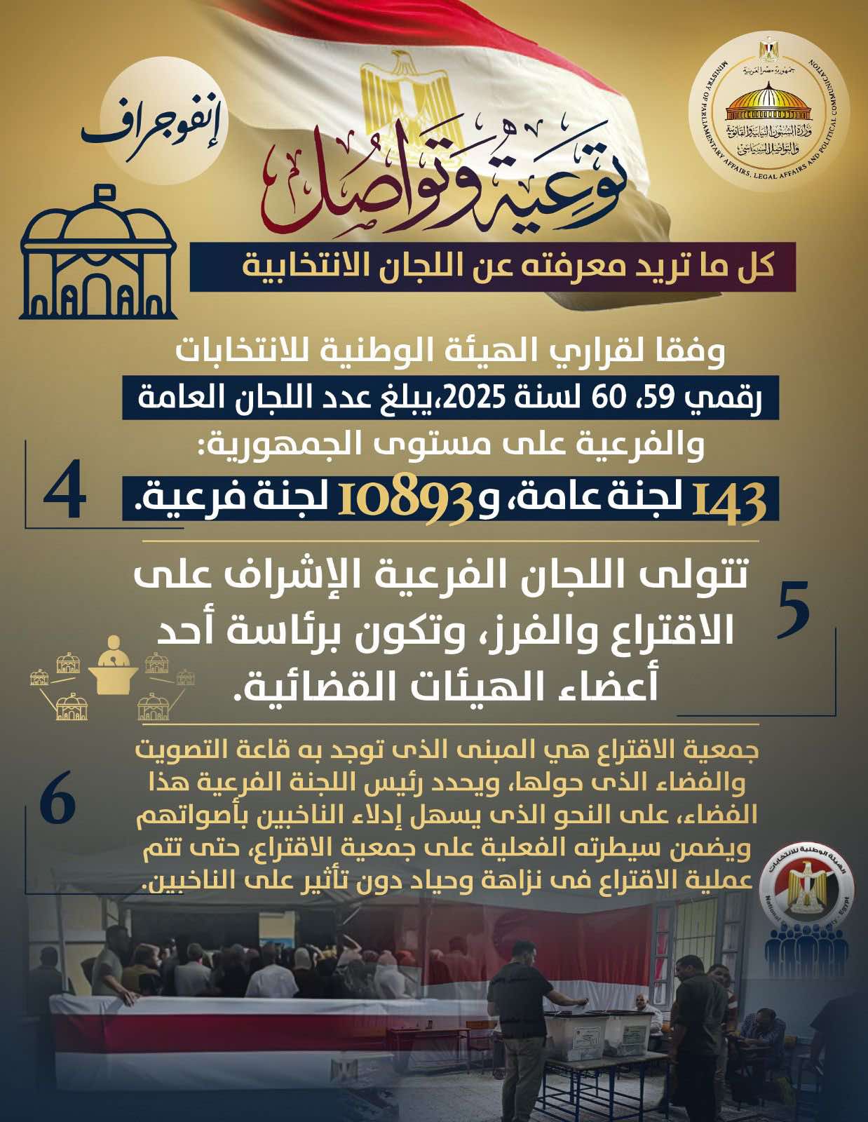 أصدرت وزارة الشؤون النيابية والقانونية بيانًا قالت فيه إنه استمرارًا لحملة توعية وتواصل التي بدأتها الوزارة بالتزامن مع انتخابات مجلس النواب ، نشرت اليوم الأحد ، إنفوجرافات توعية تتعلق باللجان الانتخابية، وكل الأسئلة حولها، بعنوان (توعية وتواصل.. كل ما تريد معرفته عن اللجان الانتخابية.. تشكيل اللجان العامة والفرعية.. المهام والاختصاصات.. لجان المتابعة بالمحافظات.. جمعية الاقتراع).