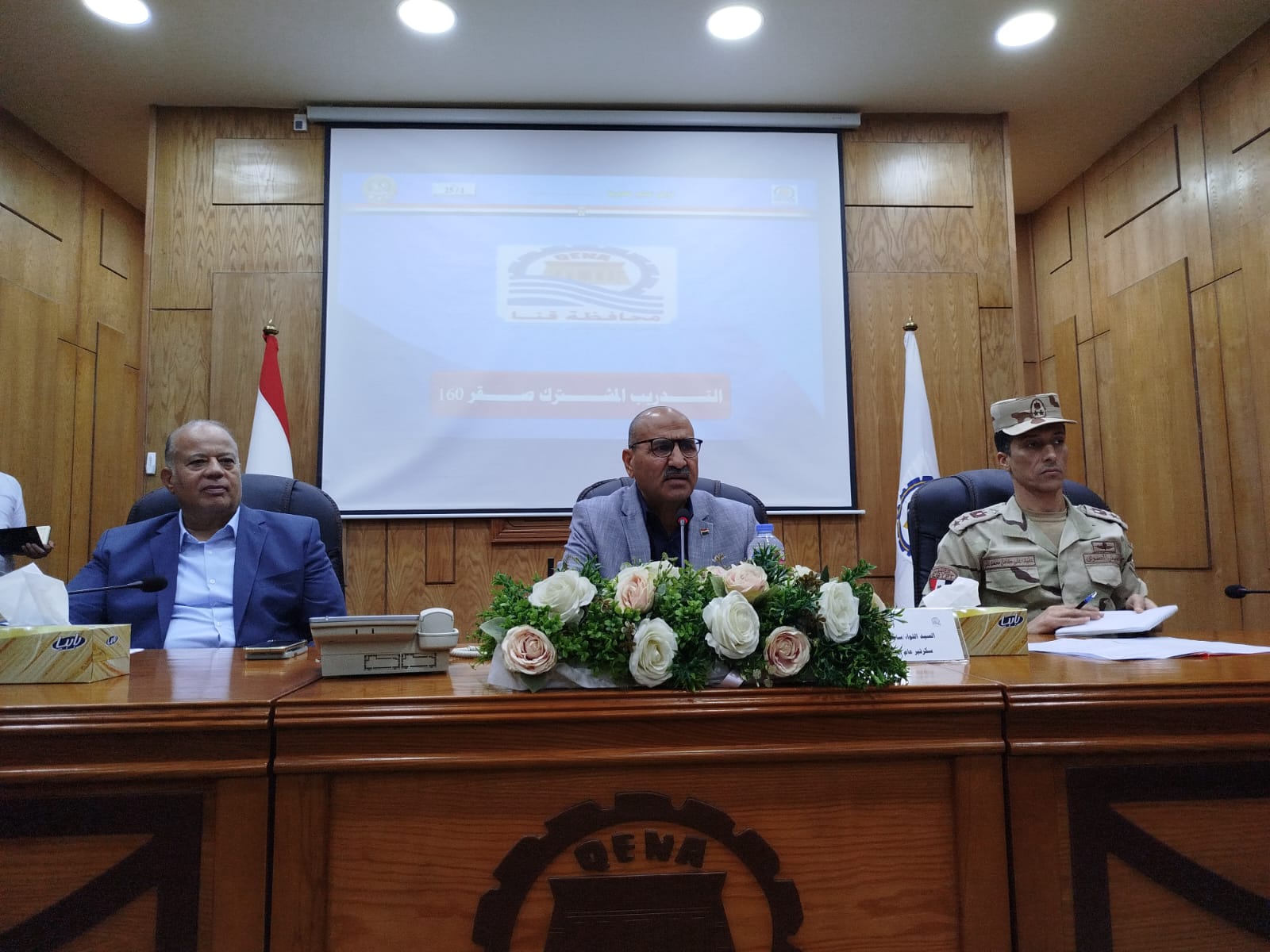 عقد اللواء سامي علام السكرتير العام لمحافظة قنا، اجتماعًا لمناقشة الترتيبات النهائية الخاصة بتنفيذ التدريب العملي المشترك "صقر 160" لمجابهة الأزمات والكوارث، والمقرر تنفيذه خلال الفترة من 21 إلى 23 ديسمبر المقبل، بالتعاون مع قوات الدفاع الشعبي والعسكري وتحت إشراف لجنة من هيئة عمليات القوات المسلحة.