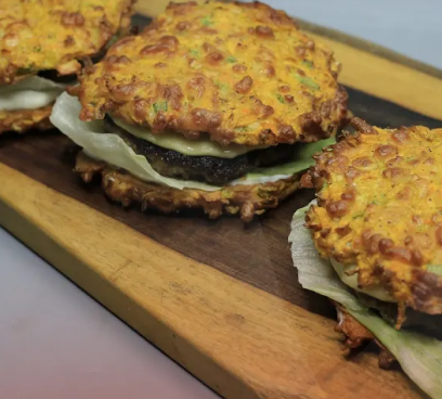 يقدم البرجر بالجبنة مع أقراص الجزر والبطاطس المحمرة.