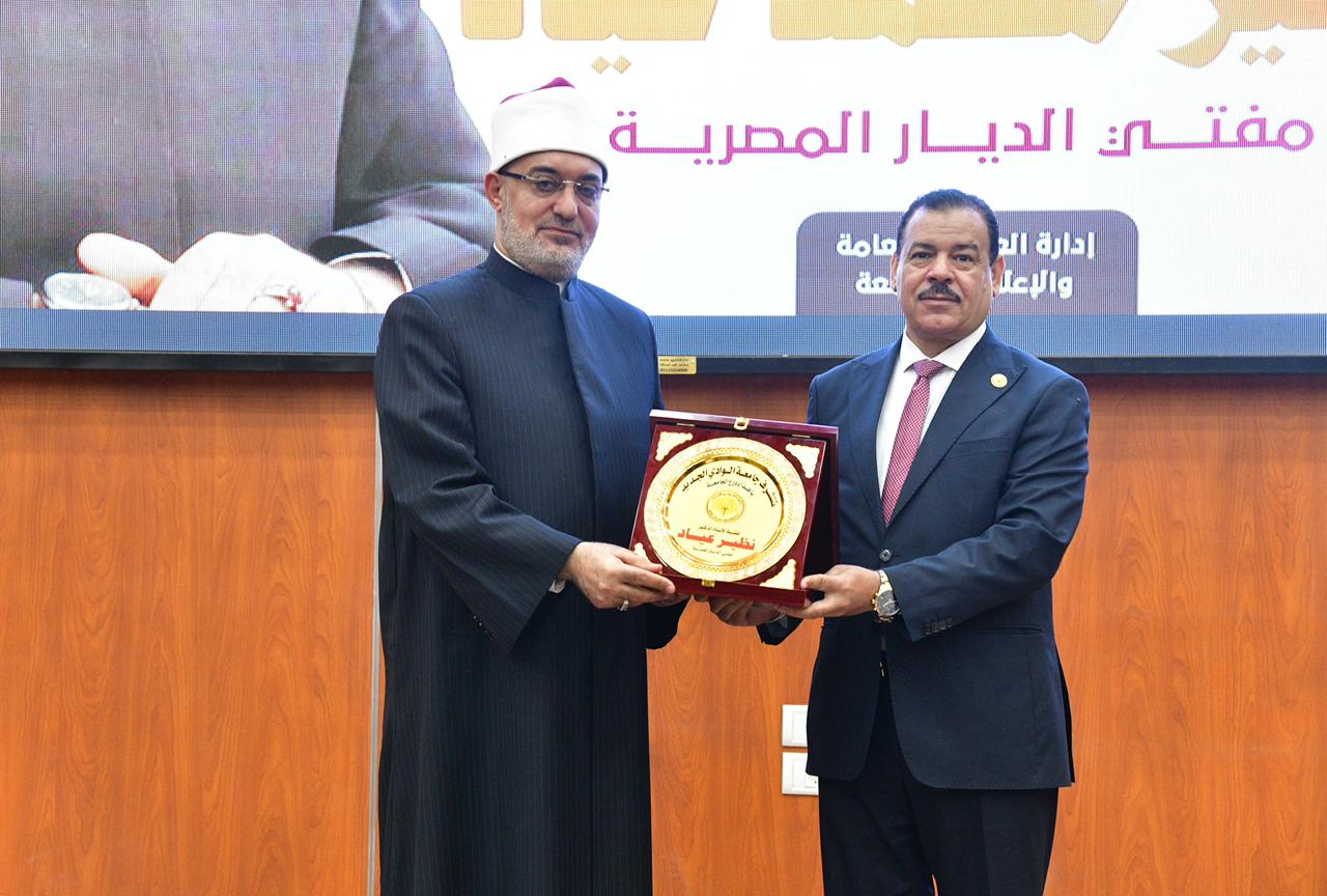 وفي لفتة تقدير وعرفان، قام الدكتور عبد العزيز طنطاوي، رئيس جامعة الوادي الجديد، بإهداء درع الجامعة إلى الدكتور نظير عياد، مفتي الجمهورية، تقديرًا لجهوده العلمية والدعوية في نشر قيم السلام والتعايش، ودوره البارز في تعزيز الحوار بين الثقافات، وترسيخ مبادئ الوسطية والاعتدال التي تميز منهج الأزهر الشريف ودار الإفتاء المصرية.