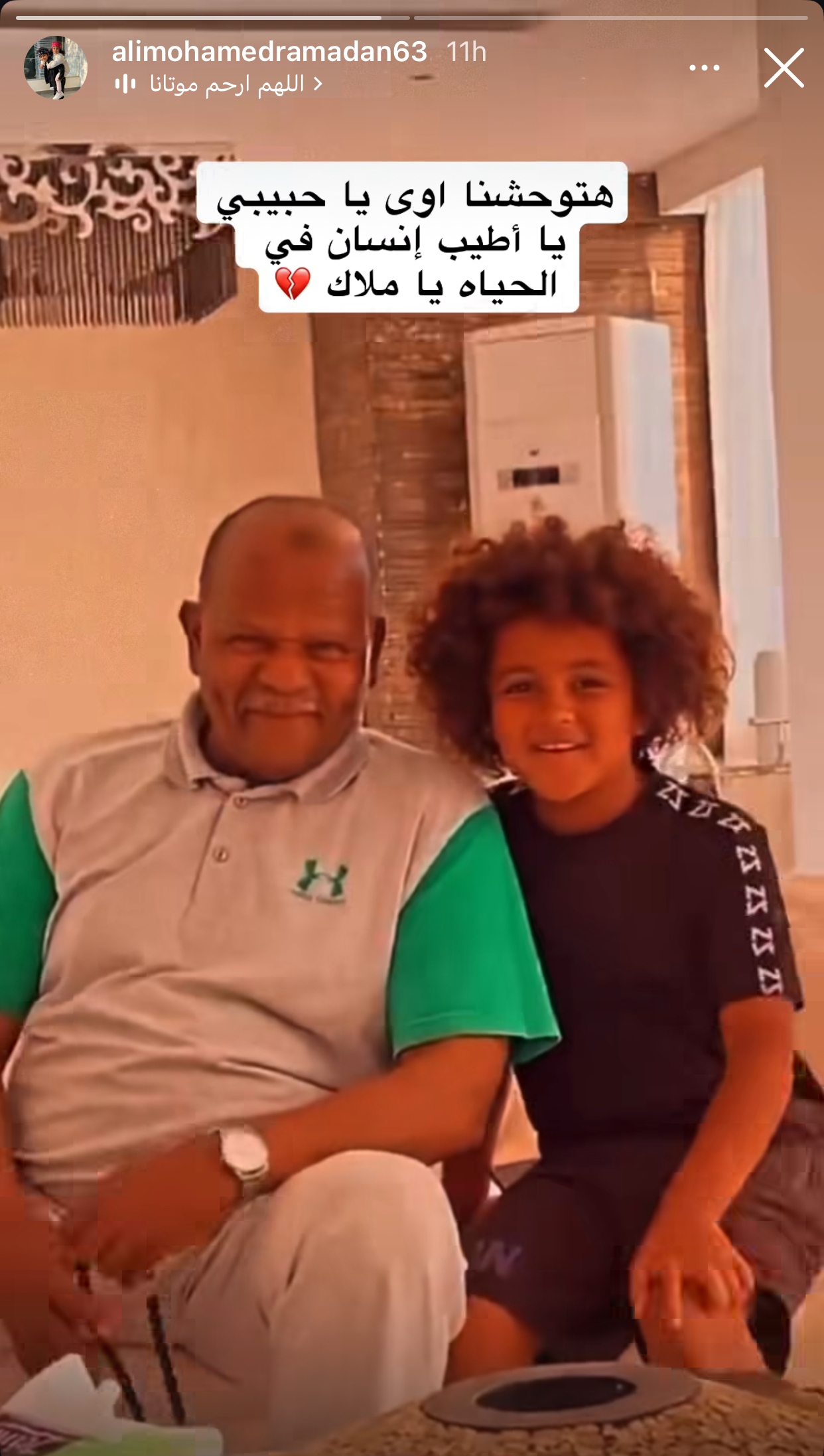 ونشر علي محمد رمضان، صورة تجمعه بجده الراحل، عبر “استوري” حسابه الشخصي بموقع “إنستجرام”، وعلق عليها: "هتوحشنا أوي يا حبيبي، يا أطيب إنسان في الحياة.. يا ملاك".