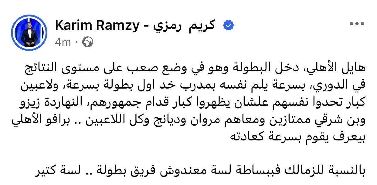 وكتب رمزي عبر حسابه الرسمي على فيسبوك: “هايل الأهلي، دخل البطولة وهو في وضع صعب على مستوى النتائج في الدوري، بسرعة يلم نفسه بمدرب خد أول بطولة بسرعة، ولاعبين كبار تحدوا نفسهم علشان يظهروا كبار قدام جمهورهم. النهاردة زيزو وبن شرقي ممتازين ومعاهم مروان وديانج وكل اللاعبين.. برافو الأهلي بيعرف يقوم بسرعة كعادته. بالنسبة للزمالك فببساطة لسه معندوش فريق بطولة.. لسه كتير.”