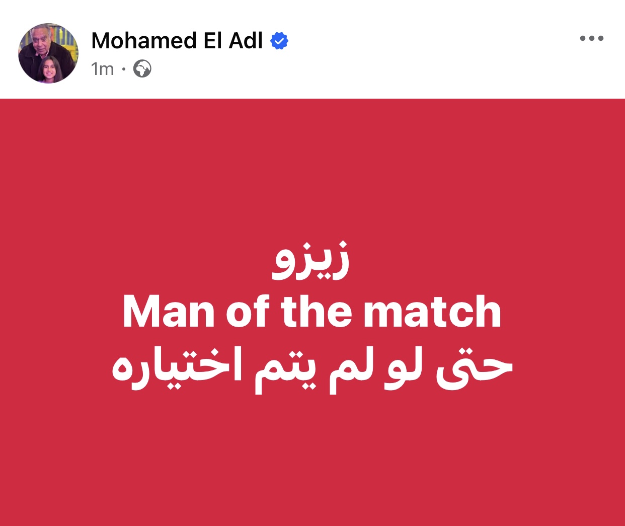 وكتب العدل عبر حسابه الشخصي بموقع فيسبوك: "زيزو رجل المباراة حتى لو لم يتم اختياره".