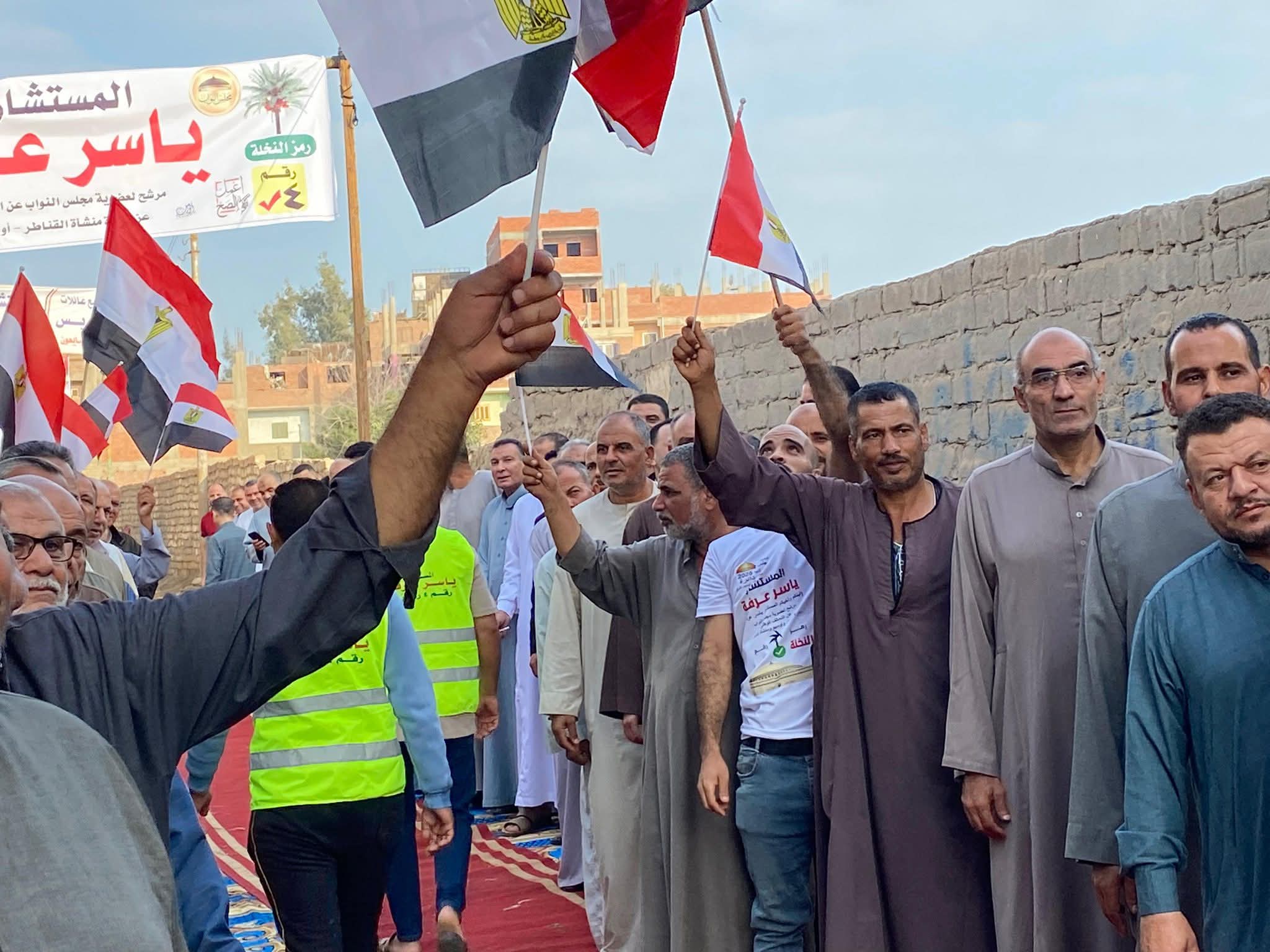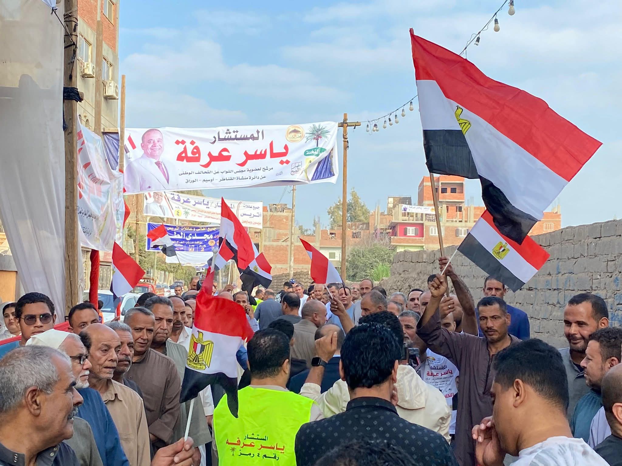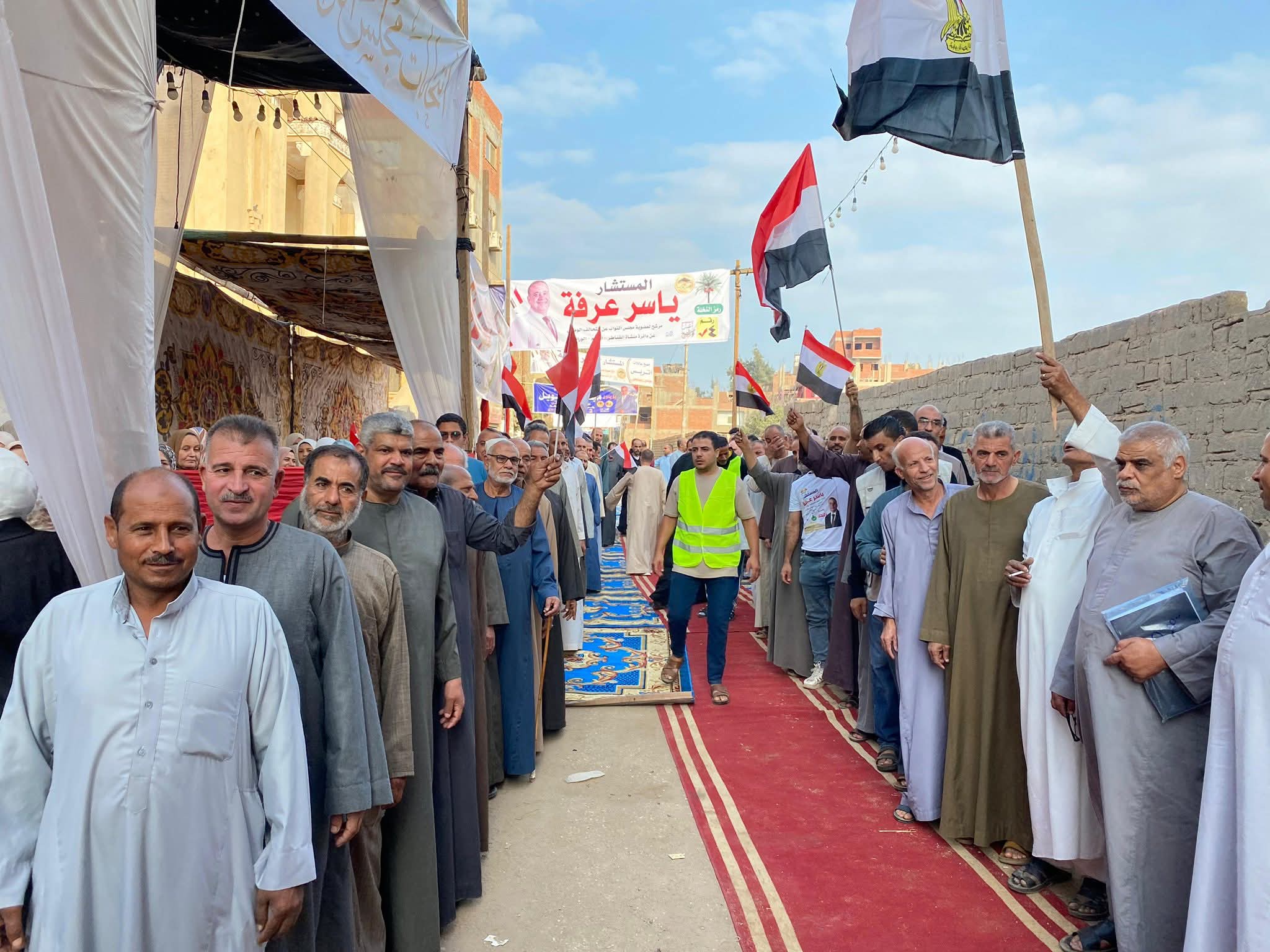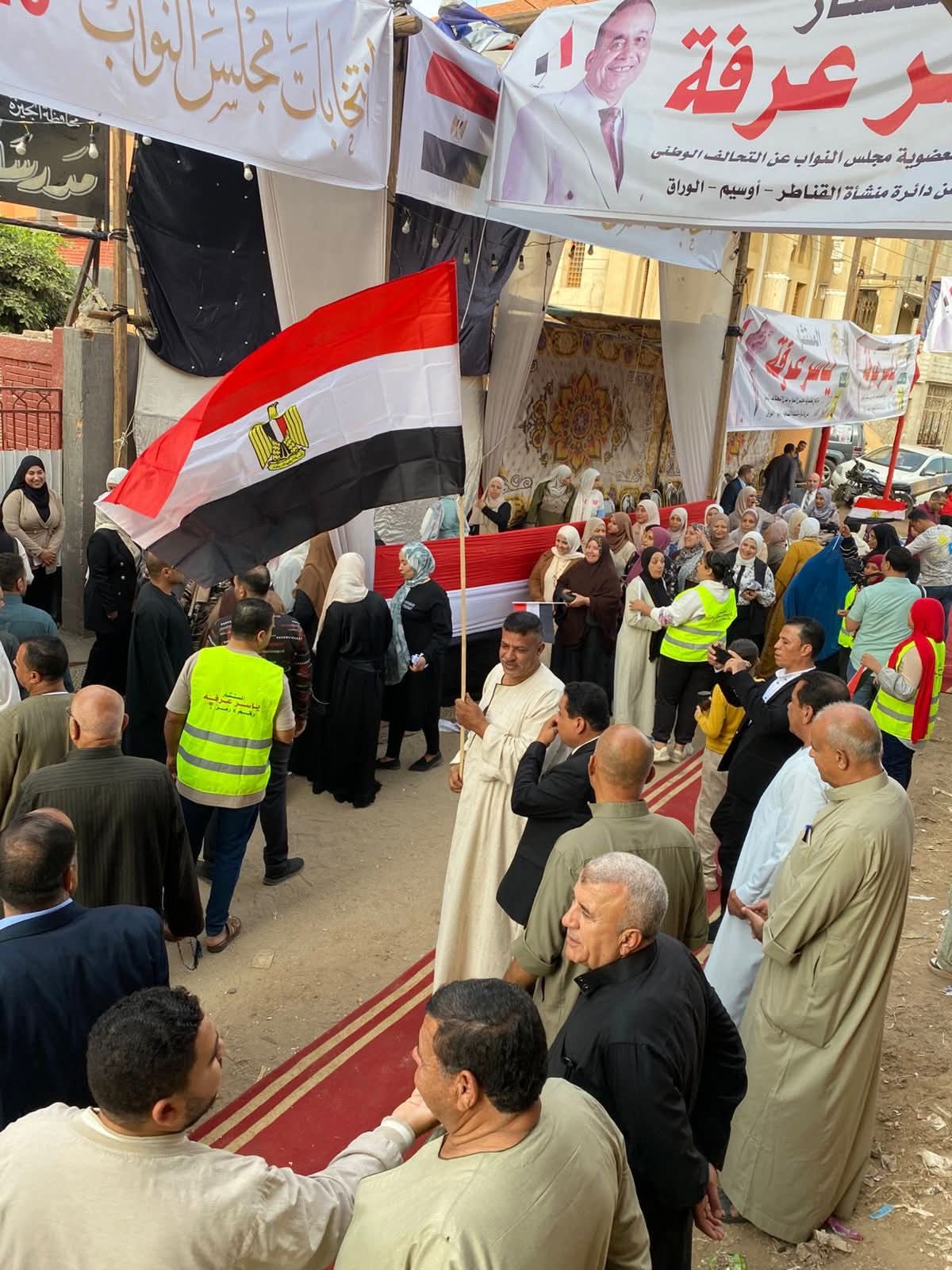 توافد عدد من المواطنين علي اللجان الانتخابية بمنطقة منشأة القناطر ضمن الدائرة 12 في محافظة الجيزة والتي تضم " منشأة القناطر وأوسيم والوراق " حاملين أعلام مصر وذلك للإدلاء بأصواتهم في اليوم الأول من المرحلة الأولي من الانتخابات البرلمانية .