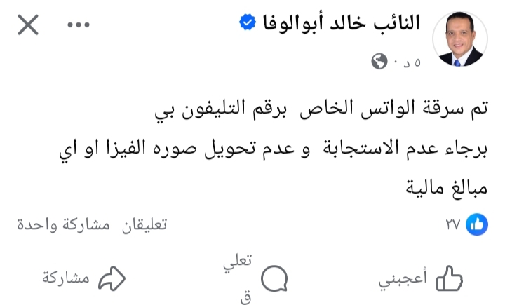 ونشر رئيس الغرفة التجارية تدوينة عاجلة كتب فيها:" تم سرقة الواتس الخاص برقم التليفون.. برجاء عدم الاستجابة وعدم تحويل صورة الفيزا أو أي مبالغ مالية لأي شخص يتواصل من خلال هذا الرقم".