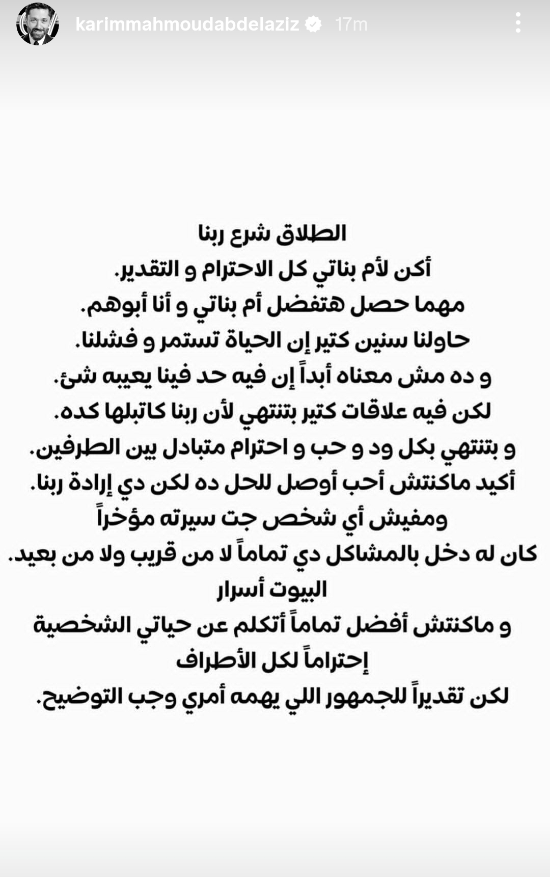 وكتب كريم محمود عبدالعزيز عبر حسابه الرسمي على موقع التواصل الاجتماعي انستجرام: الطلاق شرع ربنا .. أكن لأم بناتي كل الاحترام والتقدير..