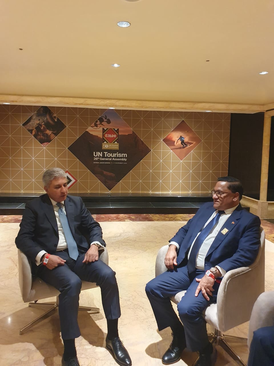 في إطار مشاركته في أعمال اجتماعات الدورة السادسة والعشرين للجمعية العامة لمنظمة الأمم المتحدة للسياحة (UN Tourism)، التي تستضيفها المملكة العربية السعودية بمدينة الرياض خلال الفترة من 7 إلى 11 نوفمبر الجاري، عقد شريف فتحي، وزير السياحة والآثار، اجتماعات ثنائية مع كل من Blendi Gonxhja وزير السياحة والثقافة والرياضة في جمهورية ألبانيا، و Vijitha Herath وزير الخارجية والتوظيف الخارجي والسياحة في سريلانكا، وذلك لبحث سبل تعزيز التعاون المشترك في مجالات السياحة والآثار.