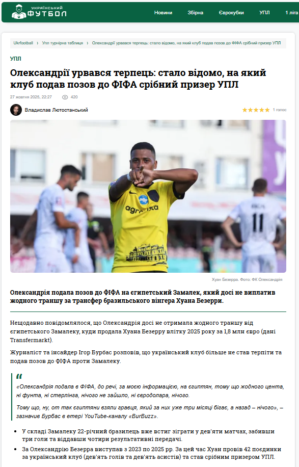 وأكدت تقارير إعلامية أن نادي أوليكساندريا الأوكراني قام بتقديم شكوى ضد نادي الزمالك بسبب عدم حصوله على أي مستحقات مالية من قيمة صفقة انتقال البرازيلي خوان بيزيرا لـ نادي الزمالك.