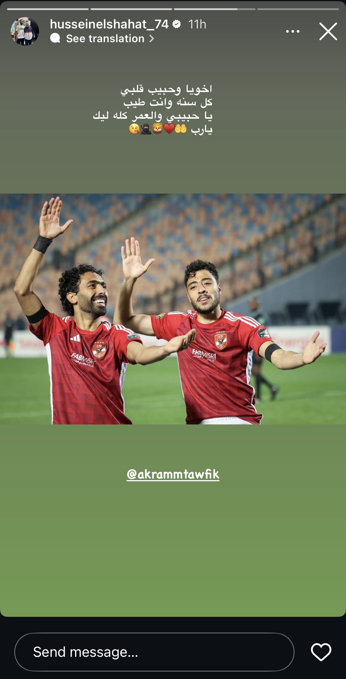 وجّه حسين الشحات، لاعب النادي الأهلي رسالة لأكرم توفيق لاعب الشمال القطري، في عيد ميلاده.