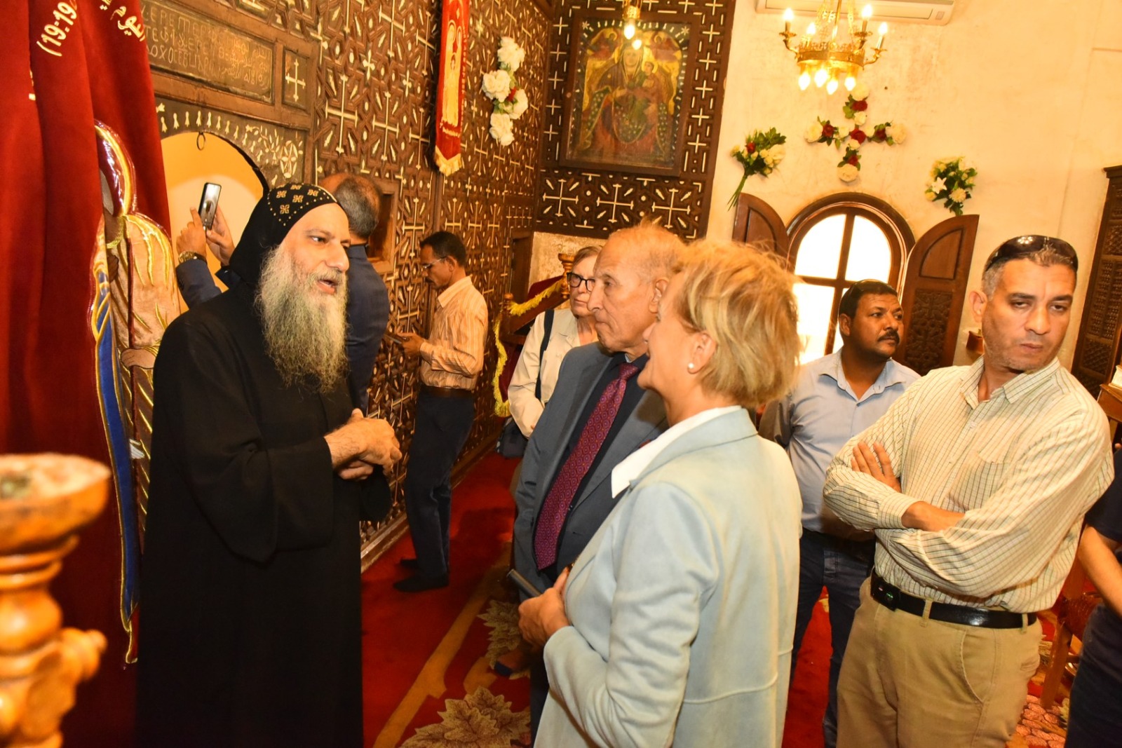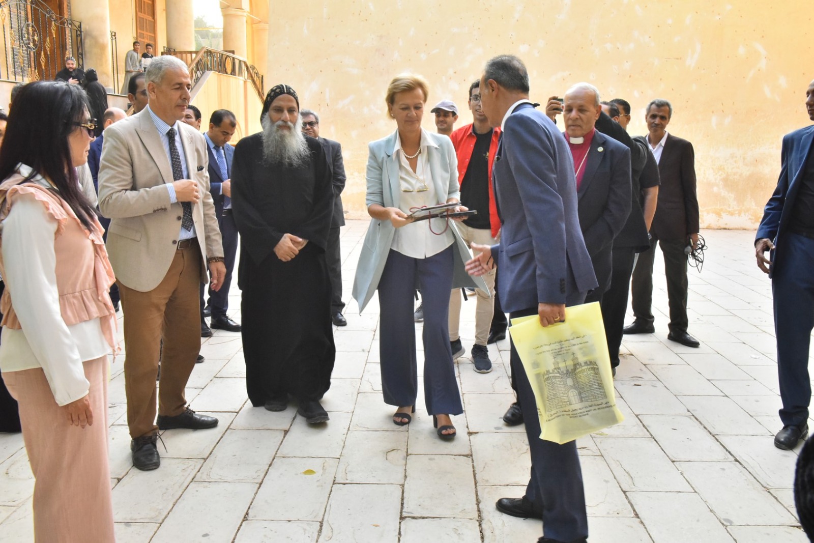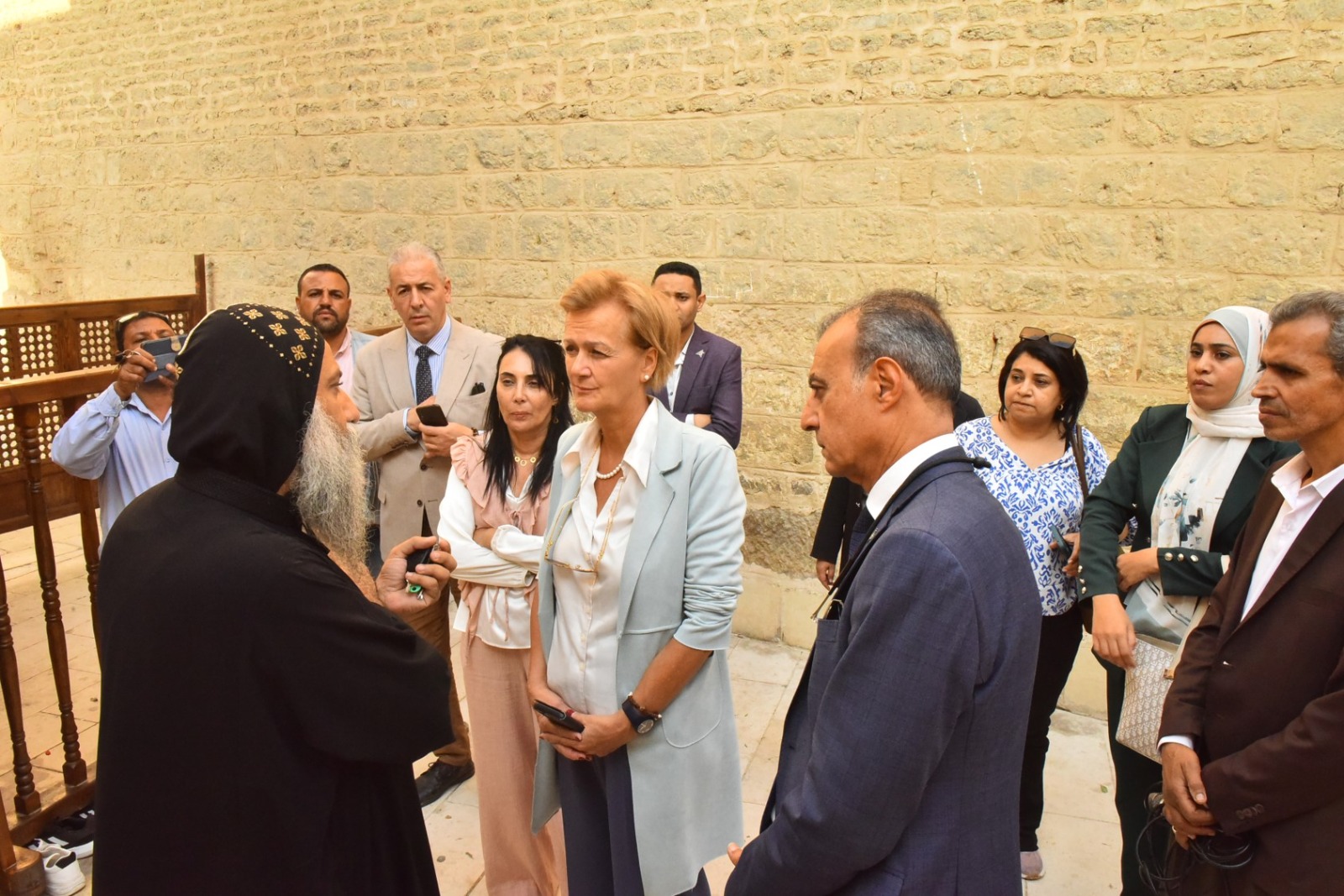 وفي محطة بالغة الأهمية ضمن الزيارة، التقى الوفد في دير المحرق بالقوصية مع سفيرة الاتحاد الأوروبي في مصر، أنجلينا رابخورست، التي كانت تزور الدير في إطار اهتمامها بمسار العائلة المقدسة كمشروع تراثي عالمي.