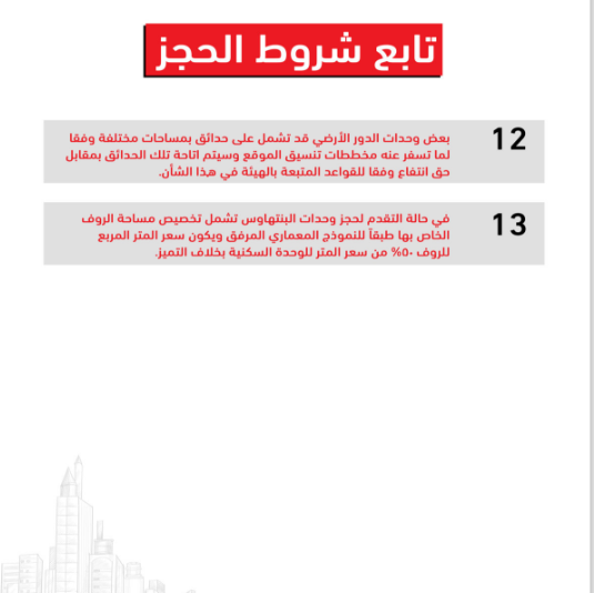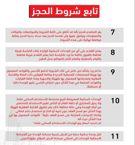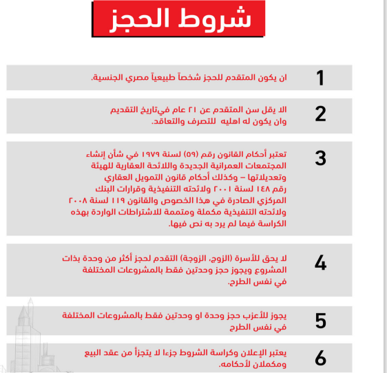 ـ يبدأ سداد القسط الأول بعد 3 أشهر من تاريخ الاستلام، مع تقديم شيكات آجلة بها قبل استلام الوحدة، كما يتم إعلان قيمة المتر مربع لكل أنواع الوحدات بالجداول المرفقة بـ كراسات شروط الحجز، بجانب باقي الشروط والإجراءات المرفقة بكراسة الشروط والتي سيتم إتاحتها مع بدء فترة الحجز.