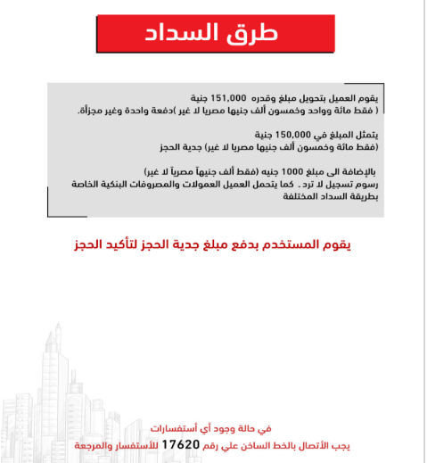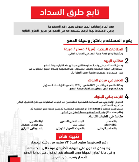 ـ نظام سداد باقي قيمة ثمن الوحدات يتم استكمال قيمة 20%، إضافة إلى 1% مصاريف إدارية، و 5 % لصالح مجالس الأمناء بالمدن محل الطرح من إجمالي ثمن الوحدات خلال شهرين من انتهاء فترة الحجز.