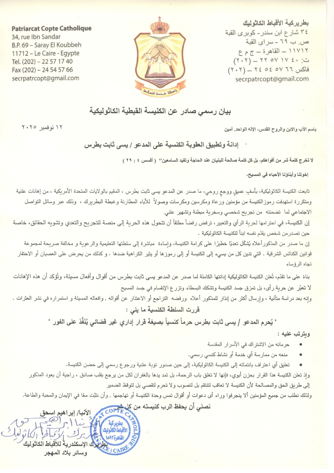 أصدرت بطريركية الأقباط الكاثوليك بيانًا رسميًا بعنوان "إدانة وتطبيق العقوبة الكنسية على المدعو يسى ثابت بطرس".