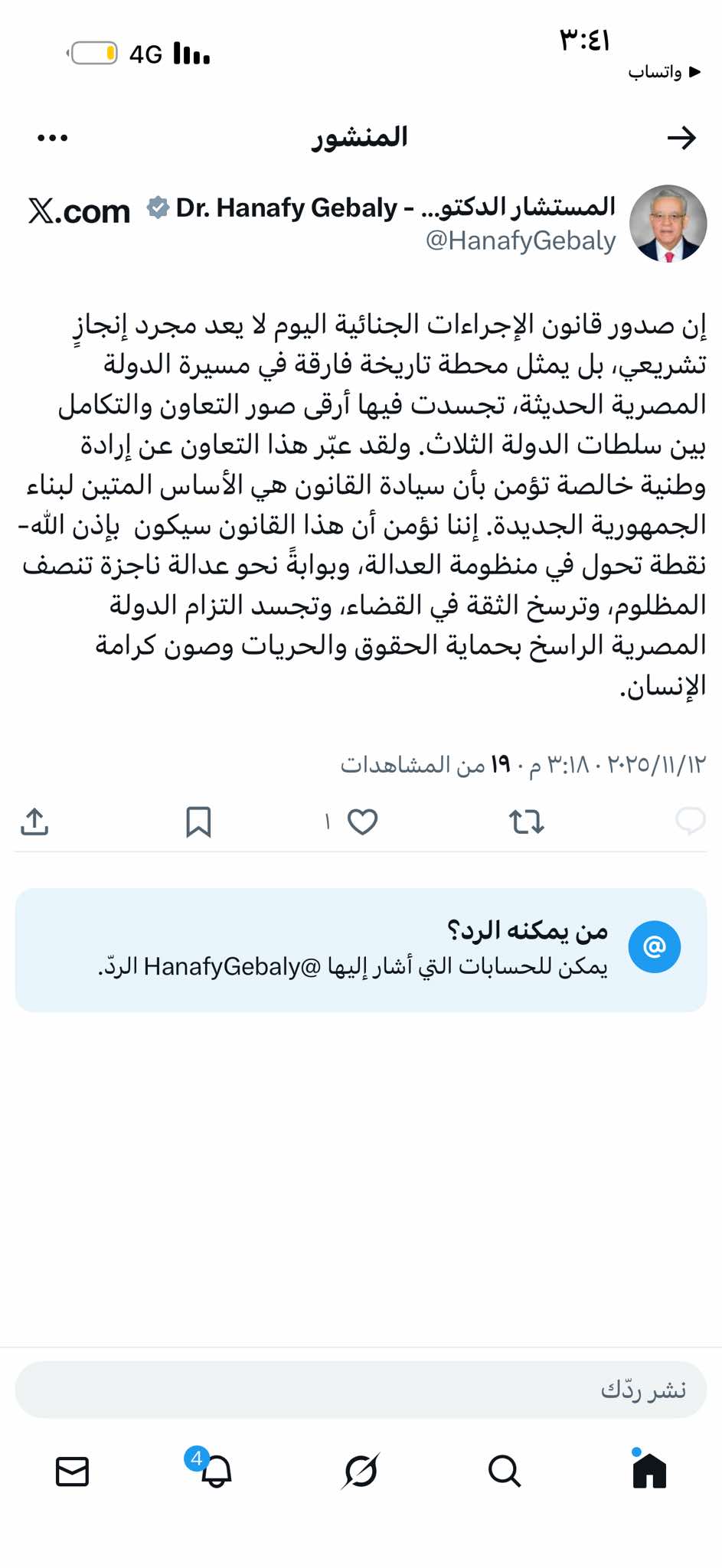 وأضاف جبالي خلال كلمةله على صفحته الرسمية على موقع التواصل الاجتماعي “ الفيس بوك” : ولقد عبّر هذا التعاون عن إرادة وطنية خالصة تؤمن بأن سيادة القانون هي الأساس المتين لبناء الجمهورية الجديدة. إننا نؤمن أن هذا القانون سيكون بإذن الله- نقطة تحول في منظومة العدالة، وبوابةً نحو عدالة ناجزة تنصف المظلوم، وترسخ الثقة في القضاء، وتجسد التزام الدولة المصرية الراسخ بحماية الحقوق والحريات وصون كرامة الإنسان.
