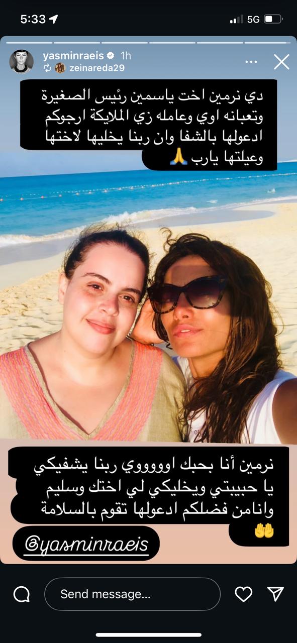 وشاركت زينة صورة عبر ستوري بموقع انستجرام، وعلقت عليها: "دي نرمين أخت ياسمين رئيس، تعبانة أوي، عاملة زي الملايكة، أرجوكم ادعولها بالشفاء، ربنا يخليها لأختها وعيلتها".