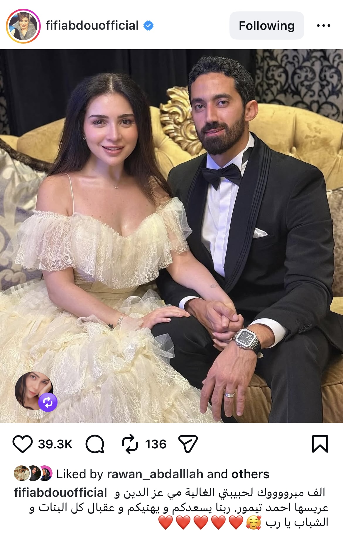 وحرص عدد من النجوم على تقديم التهاني للنجمة مي عز الدين، على رأسهم الفنان تامر حسني الذي كتب عبر خاصية القصص القصيرة بحسابه على إنستجرام كتب: مليون مبروك لأختي وصديقة مشوار النجاح، النجمة الجميلة مي عز الدين، وأخويا وحبيبي كابتن أحمد تيمور ربنا يسعدكم يارب مليون مبروك.