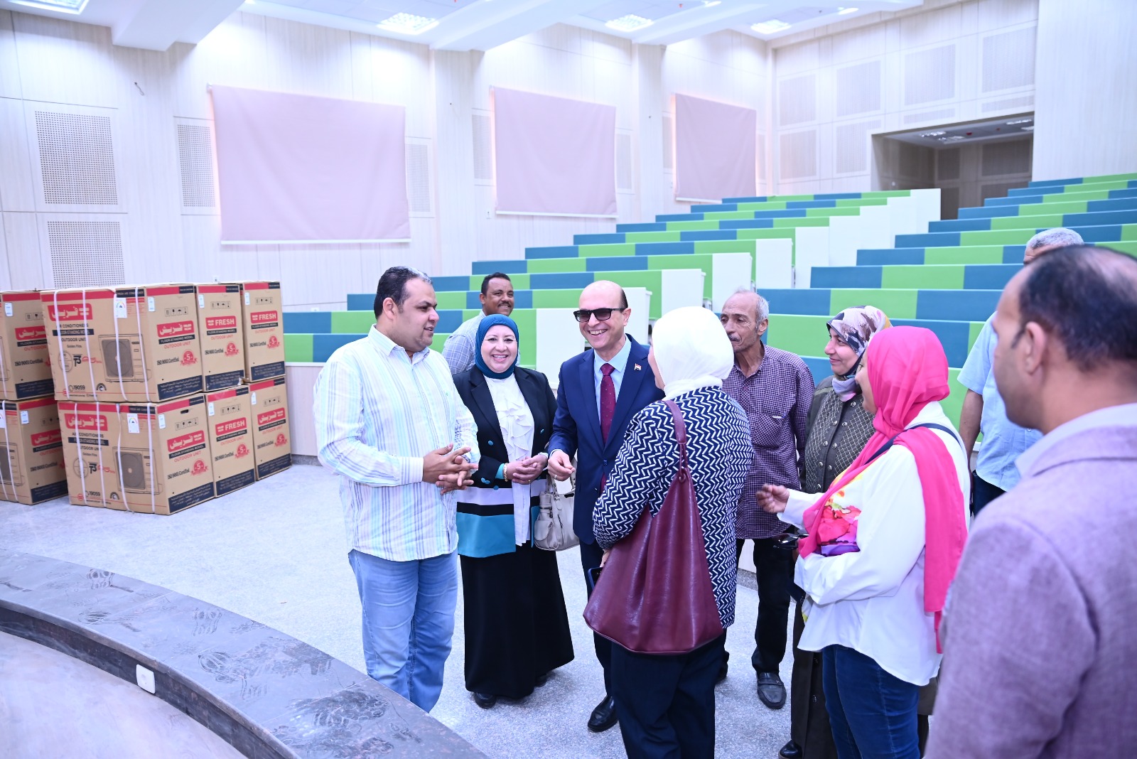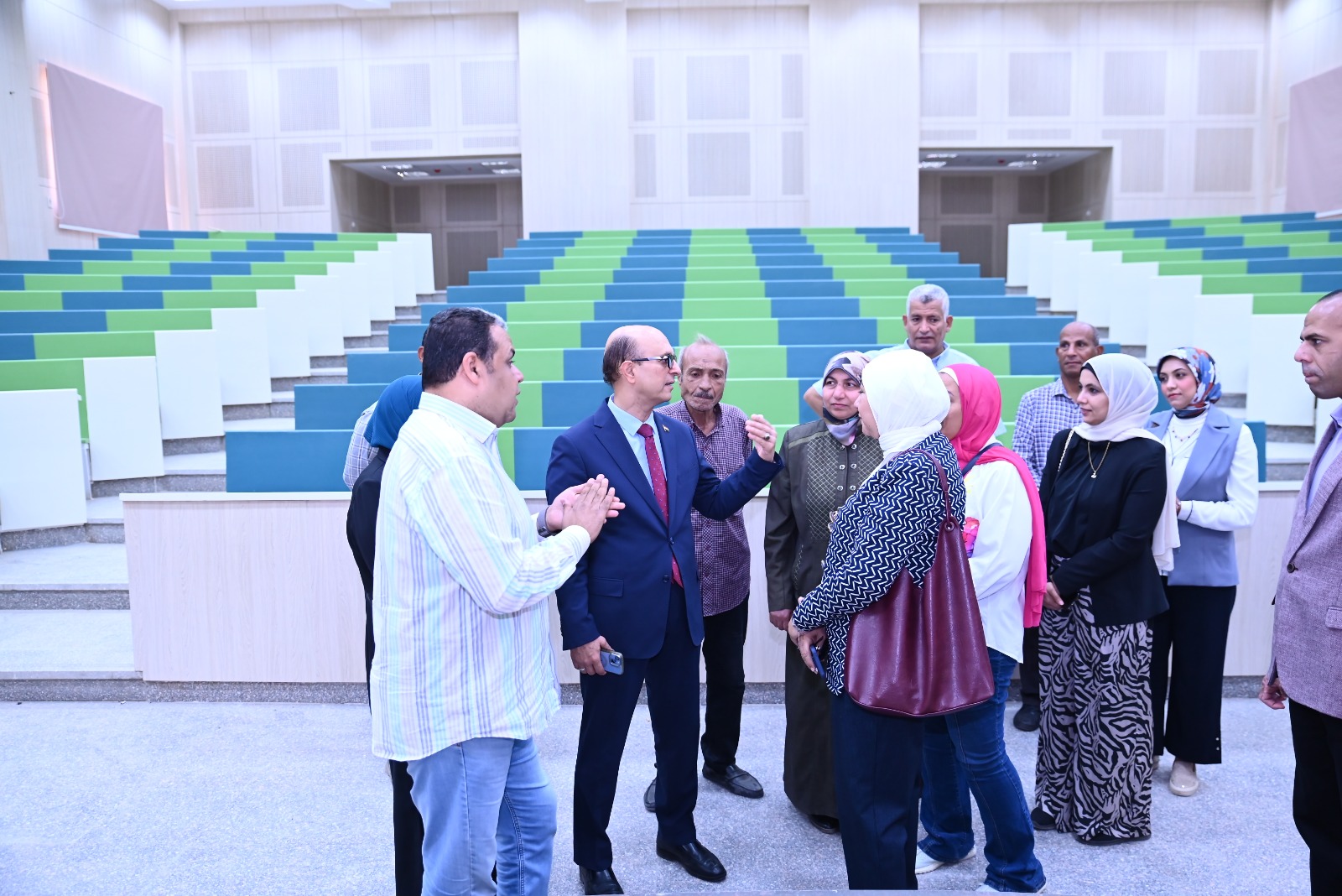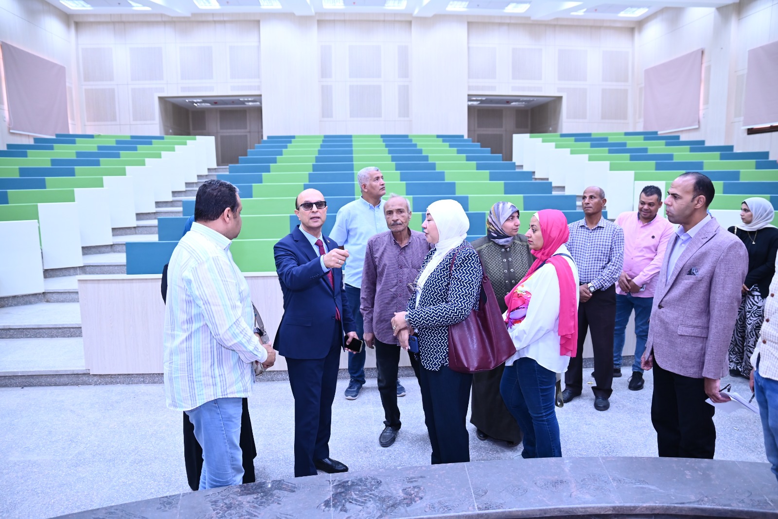 واستمع الدكتور المنشاوي خلال جولته إلى عرض تفصيلي من الدكتور شحاتة الضبع، المستشار الهندسي، حول الموقف التنفيذي للمباني، والتي تشمل مبنى المعامل، والمدرجات الغربية والشرقية، والمبنى التعليمي، حيث اطّلع على نسب الإنجاز وأعمال التشطيبات والفرش والتجهيزات الفنية بكل مبنى.