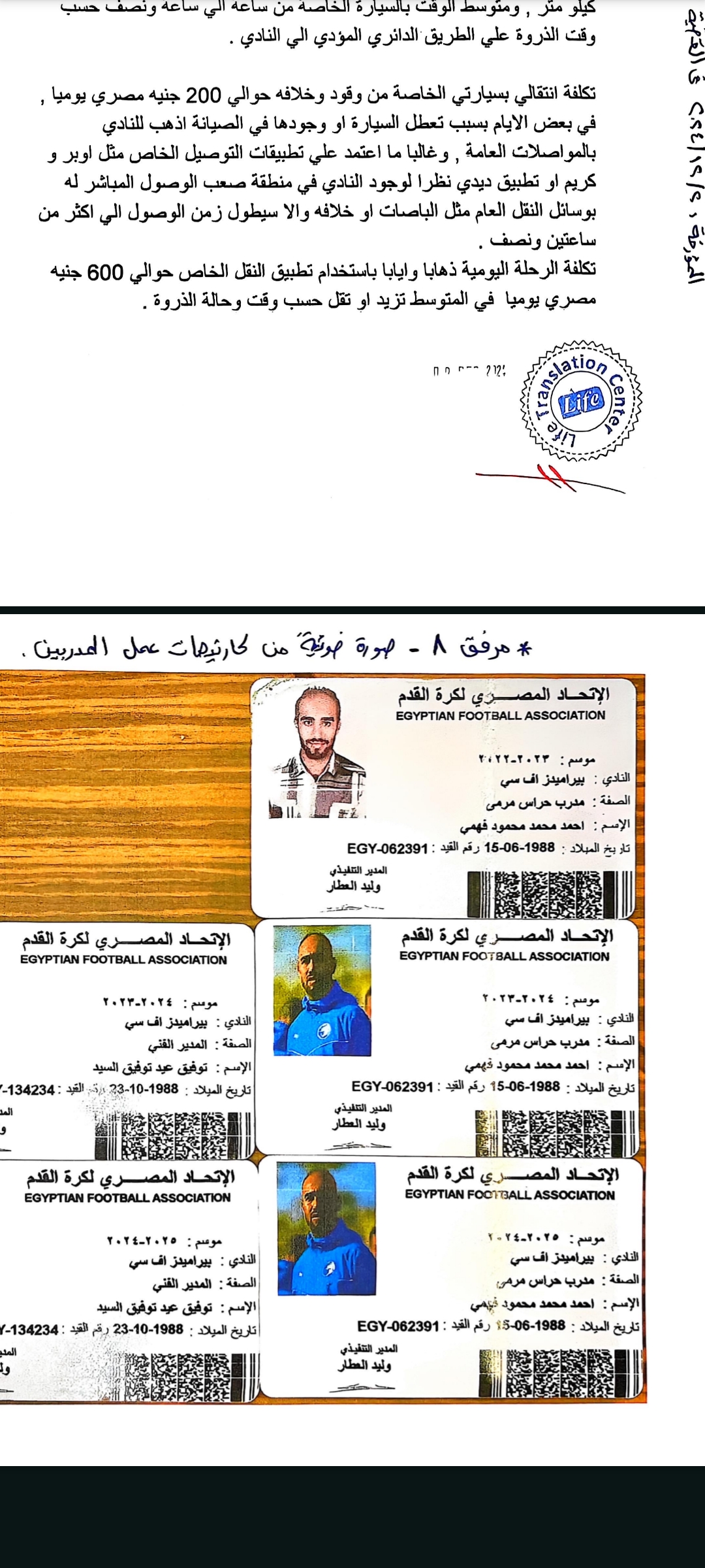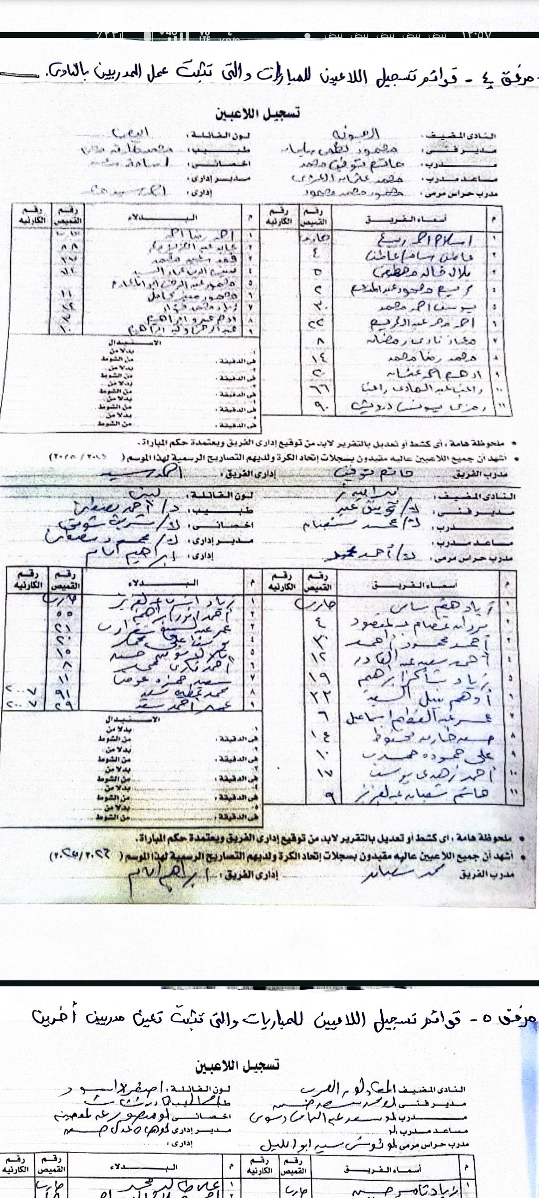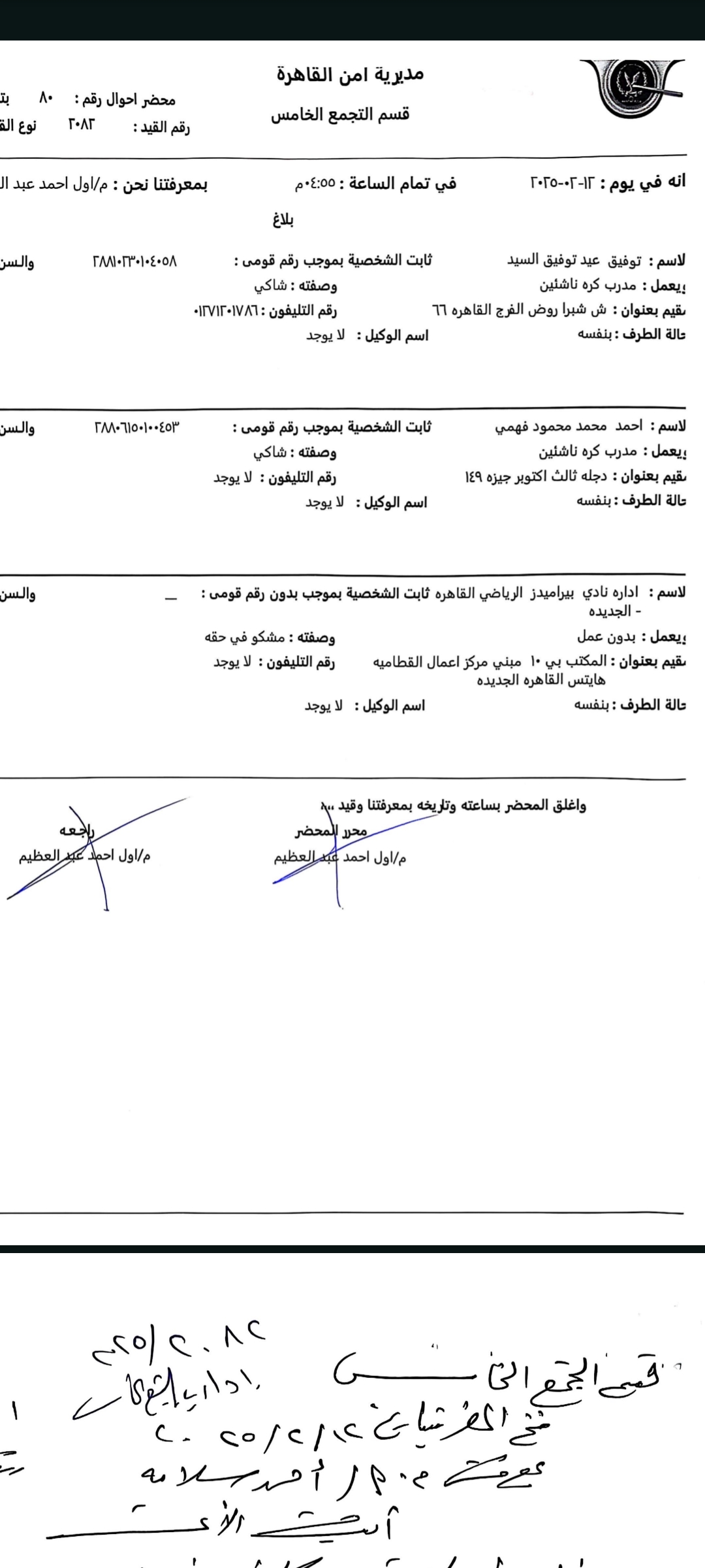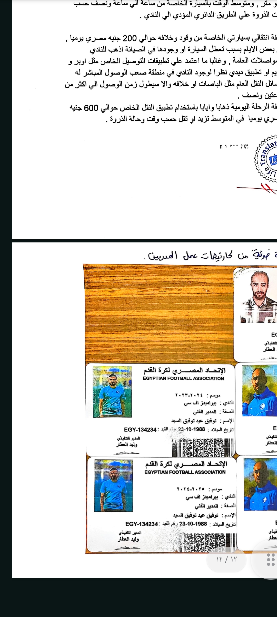 وحصل أبناء المبلغين جميعا على مستند رسمي من الاتحاد المصري لكرة القدم بتاريخ 27 / 8 /2024 يفيد بأنه لاعب حر وغير مقيد على قوائم نادي بيراميدز، ثم فوجئ لاحقا بقيده في سجلات الاتحاد على قوائم النادي ذاتها، وهو ما يعد دليلا دامغًا على وقوع جريمة التزوير والاستعمال من قبل المشكو في حقهم.