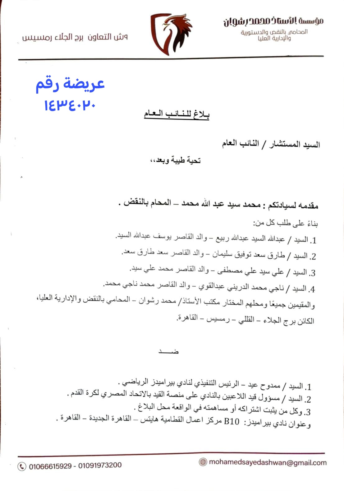 ج/ انا بتقدم ببلاغ ضد إدارة بيراميدز لقيامهم بفصلي تعسفيا من عملي كمدرب في النادي