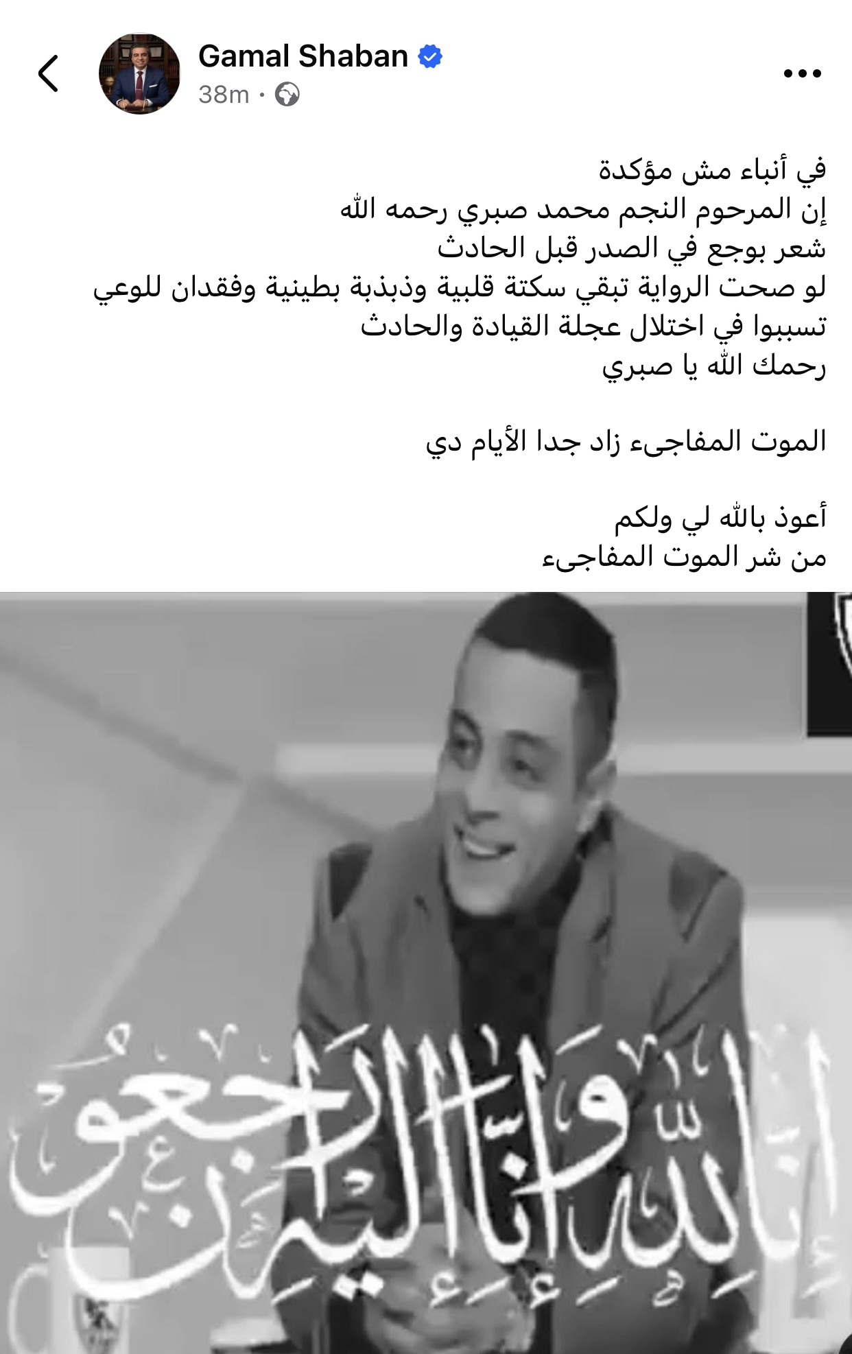 وقال شعبان في منشور له عبر حسابه الشخصي بموقع فيسبوك: “في أنباء مش مؤكدة إن المرحوم النجم محمد صبري رحمه الله شعر بوجع في الصدر قبل الحادث. لو صحت الرواية تبقى سكتة قلبية وذبذبة بطينية وفقدان للوعي سببوا في اختلال عجلة القيادة والحادث. رحمك الله يا صبري. الموت المفاجئ زاد جدًا الأيام دي. أعوذ بالله لي ولكم من شر الموت المفاجئ”.