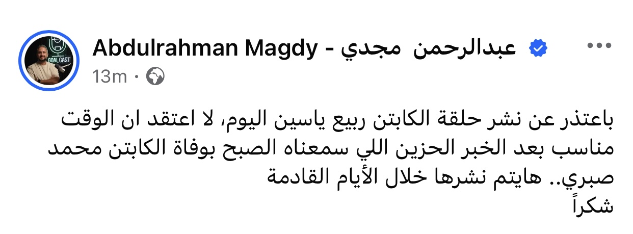 وكتب عبدالرحمن مجدي عبر حسابه الشخصي على فيسبوك: “باعتذر عن نشر حلقة الكابتن ربيع ياسين اليوم، لا اعتقد ان الوقت مناسب بعد الخبر الحزين اللي سمعناه الصبح بوفاة الكابتن محمد صبري.. هايتم نشرها خلال الأيام القادمة شكراً”.