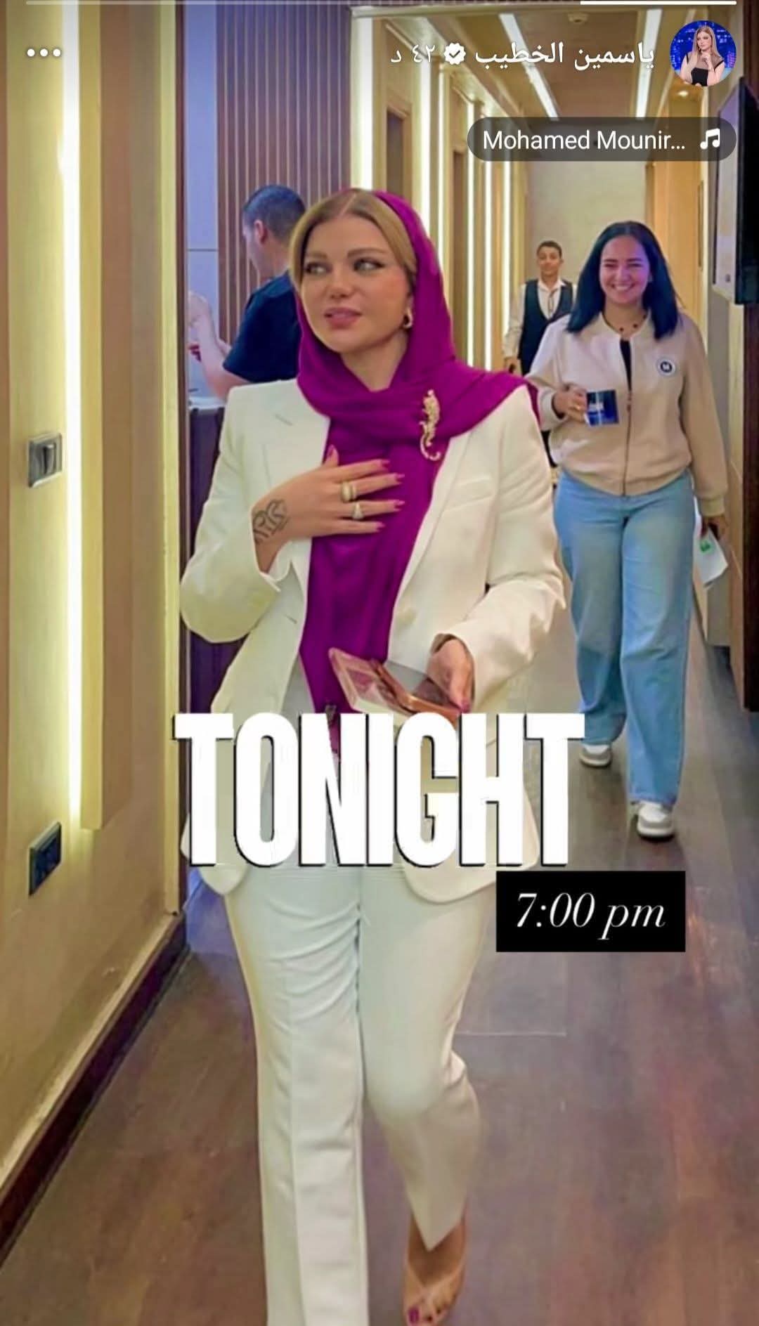 ونشرت ياسمين الخطيب، صورة لها من إطلالتها في حلقة اليوم مع عبد الله رشدي، عبر قناة “الشمس”، حيث ظهرت بإطلالة مُحتشمة وحجابا على الرأس، كشرط لظهور «رشدي» معها في البرنامج.