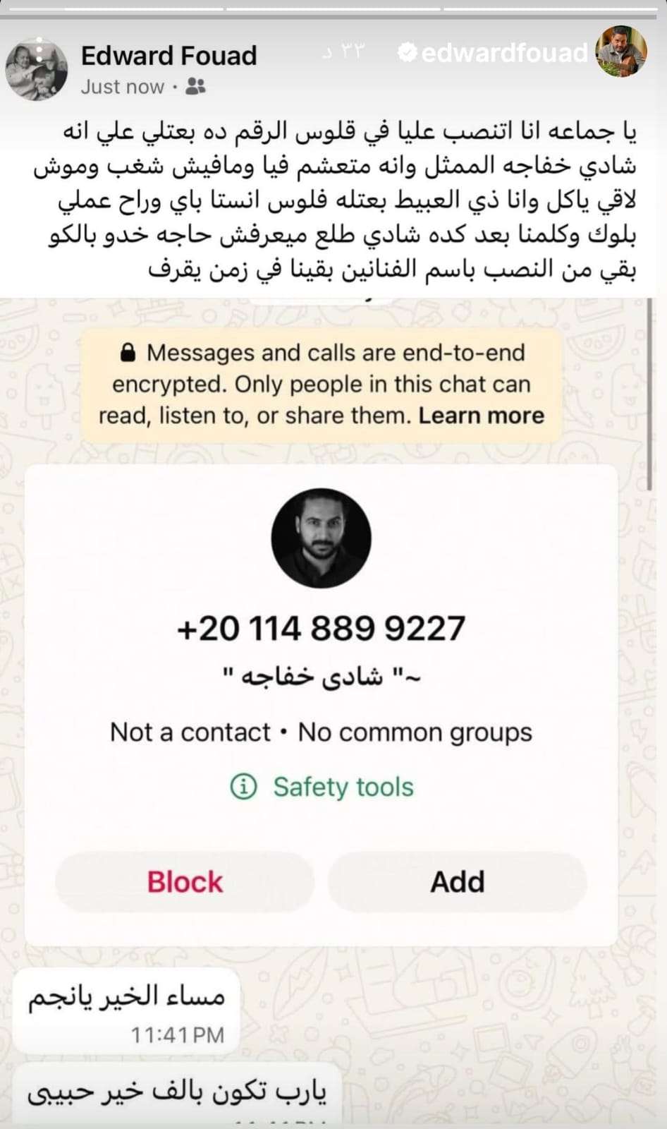مضيفا: "للأسف، تم استغلال طيبة الأستاذ إدوارد وتعرض لموقف غير مقبول، أي حد اتعرض لنفس الموقف يا ريت يبعتلي التفاصيل في رسالة خاصة، علشان بجمع كل البيانات والإجراءات القانونية بالفعل بدأت، برجاء التأكد عند التعامل مع أي رقم غير رقمي المعروف والوحيد اللي معايا من سنوات (ينتهي بـ 010)، التحذير ده لحماية الجميع ومنع أي استغلال.