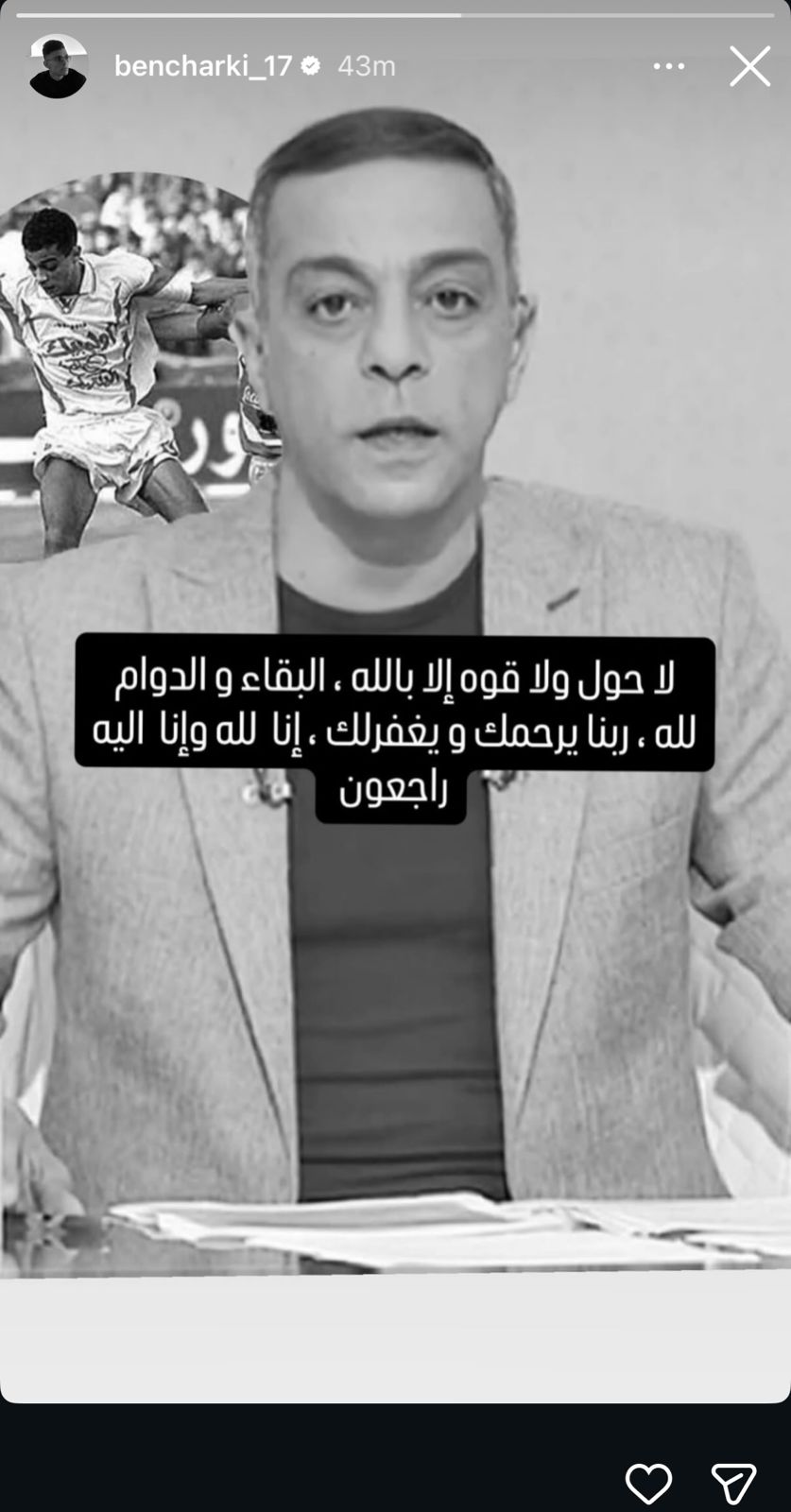 وكتب بن شرقي عبر ستوري انستجرام: “لا حول ولا قوة الا بالله البقاء والدوام لله ربنا يرحمك ويغفر لك”.