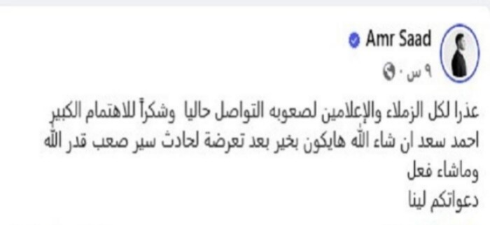 نشر الفنان عمرو سعد، شقيق أحمد، منشوراً على حسابه الرسمي على "فيسبوك"، أكد فيه صعوبة التواصل مع الإعلاميين والزملاء في الوقت الحالي، وشكر الجمهور على اهتمامهم الكبير، موضحاً أن أحمد سعد سيظل تحت الرعاية الطبية لحين الاطمئنان الكامل على حالته الصحية.