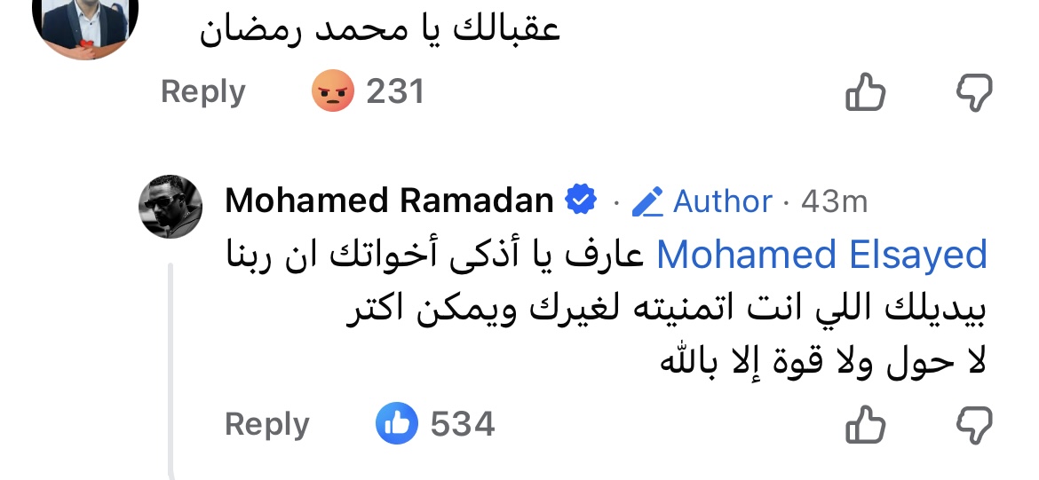 وعلق متابع على المنشور: “عقبالك يا محمد يا رمضان”، ليرد عليه: “عارف يا اذكى اخواتك ان ربنا بيديلك اللي انت اتمنيته لغيرك ويمكن اكتر لا حول ولا قوة الإ بالله”.