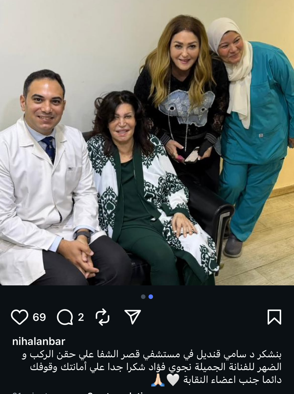 ونشرت نهال عنبر صورة عبر تطبيق انستجرام وعلقت عليها قائلاً:" بنشكر د سامي قنديل علي حقن الركب و الظهر للفنانة الجميلة نجوي فؤاد شكرا جدا علي أمانتك و وقوفك دائما جنب اعضاء النقابة".