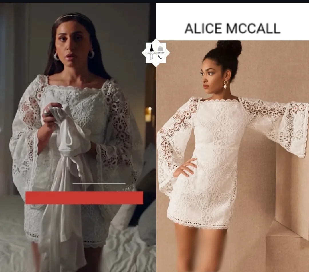 تميز الفستان بتفاصيل دانتيل دقيقة تمنح طابعًا رومانسيًا، إلى جانب قصّة ناعمة مستوحاة من اللمسات الأسترالية المعتادة في تصاميم Alice McCall، ما جعل الإطلالة تجمع بين البساطة والرقي دون مبالغة.