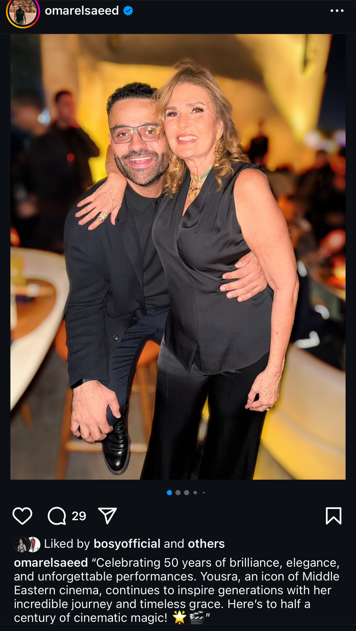 نشر الفنان عمر سعيد صور للفنانة يسرا عبر حسابه الرسمي بموقع إنستجرام، عبّر فيه عن إعجابه الكبير بالفنانة يسرا ومسيرتها الفنية الممتدة، والتي وصفها بأنها “خمسون سنة من الشياكة والتألق والأدوار التي لا تُنسى”.