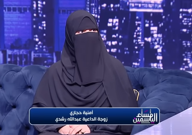 وقالت أمنية خلال اللقاء: «عبد الله رشدي مش صاحب فضل عليّا في ارتدائي الحجاب، أنا كنت بتابع محتواه، وكنت بفكر ألبس الخمار، وبدأت أتعلم علم شرعي، وأفكر في النقاب، فسألته عن النقاب فرض ولا سنة، ورد وقال: أنا شايف إن لبسك محترم، وده كان بداية الكلام بينا».