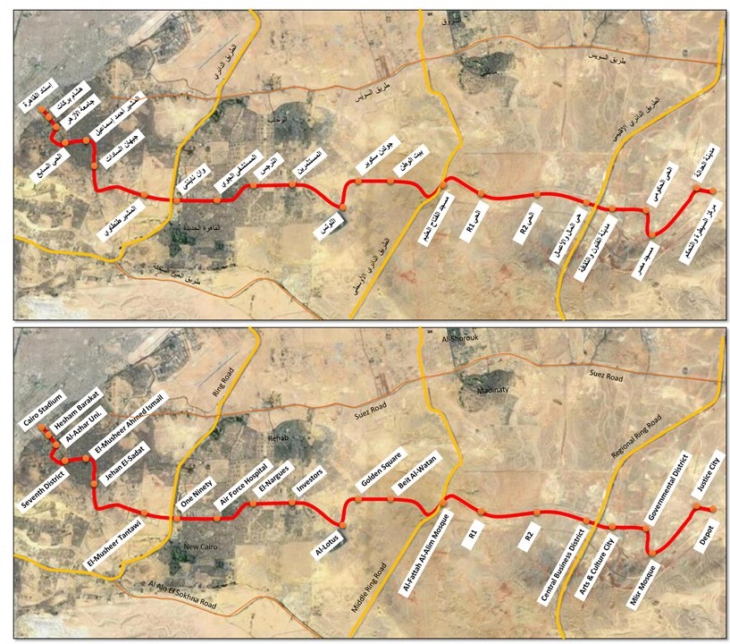ويصل الطول الاجمالي لمشروعي مونوريل شرق وغرب النيل الى نحو 100 كيلومتر بعدد 35 محطة مما يجعله احد اكبر مشروعات النقل الكهربائي الحديثة في مصر.