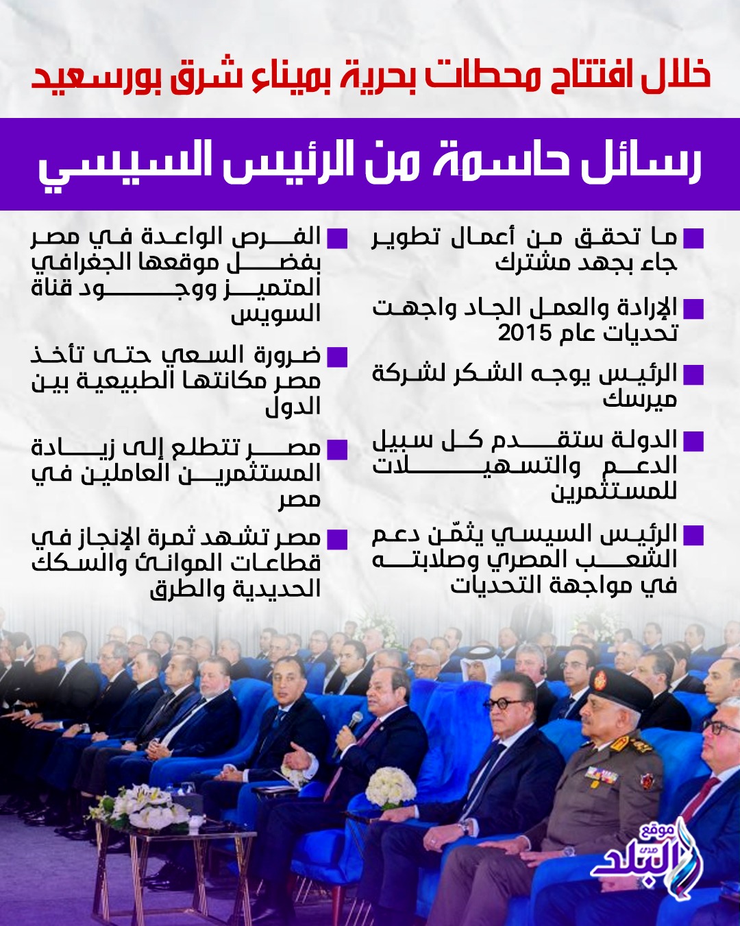 شهد الرئيس عبد الفتاح السيسي، اليوم الأحد، افتتاح عدد من المحطات البحرية بالمنطقة الاقتصادية لقناة السويس بميناء شرق بورسعيد.