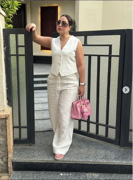 تألقت بوسي في الصور بإطلالة عصرية، حيث ارتدت بنطلون كتان باللون الأوف وايت مع فيست بنفس اللون لا يحمل أي نقوشات أو تطريزات.