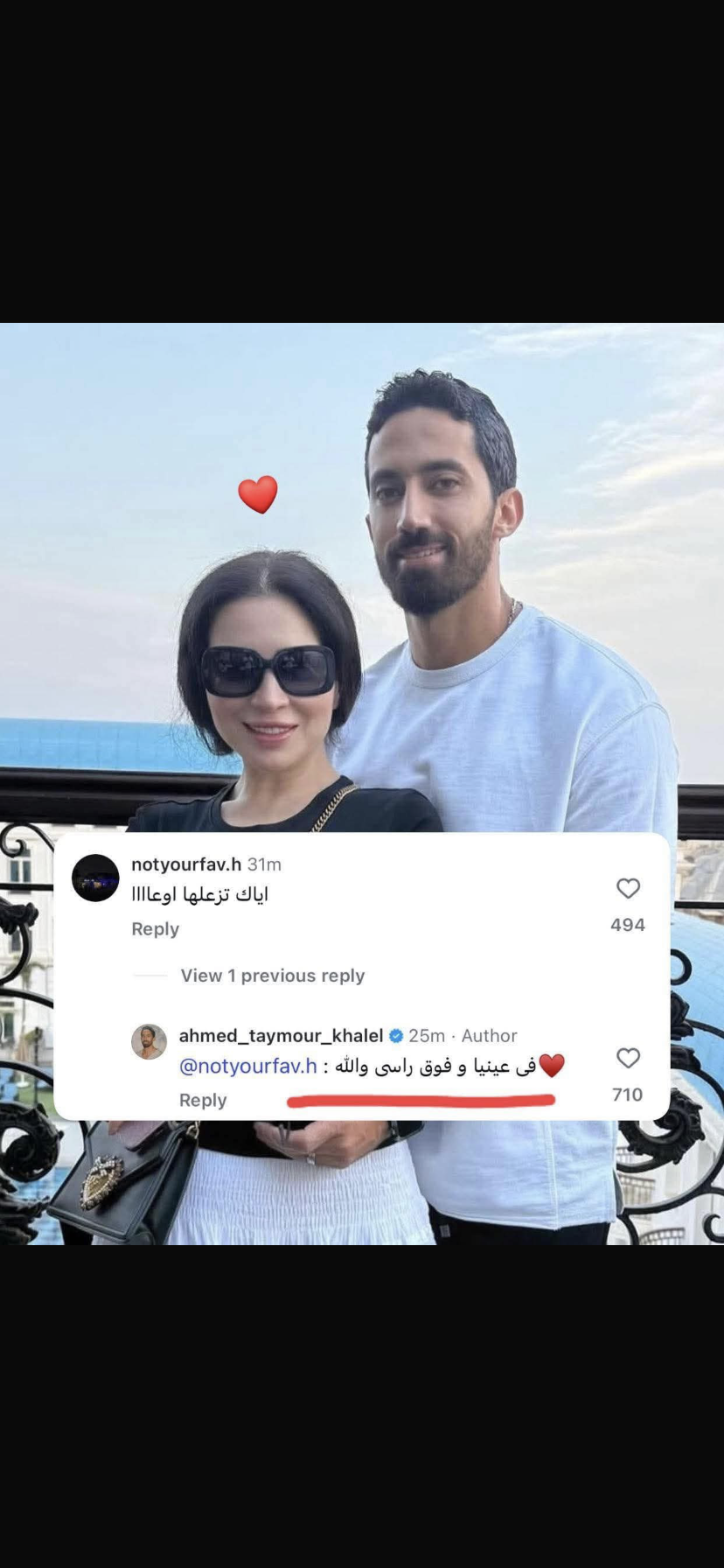 وعلقت متابعة علي صور الثنائي موجهة رسالة الي زوج مي عز الدين و كتبت : إياك تزعـ.ـلها ورد عليها الأخير : "في عينيا وفوق راسي والله".