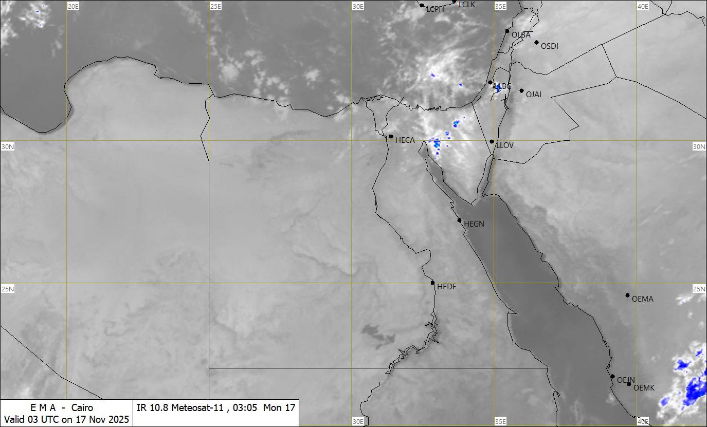 أشارت آخر صور الأقمار الصناعية، التابعة لهيئة الأرصاد، إلى تكاثر السحب المنخفضة والمتوسطة على مناطق من السواحل الشمالية الغربية يصاحبها سقوط أمطار خفيفة على مناطق متفرقة من الإسكندرية ومطروح.