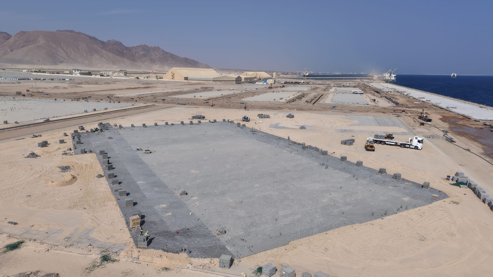 المشروع يمتد على مساحة تقارب 776 ألف متر مربع، ويتضمن رصيفًا بطول 1100 متر وبعمق 17 مترًا. وتم الانتهاء بالكامل من أعمال البنية التحتية التي نفذتها شركات وطنية مصرية متخصصة، فيما بدأت أعمال البنية الفوقية للمحطة.