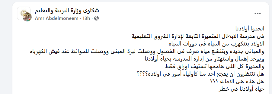 كتب عمر عبد المنعم ولي أمر استغاثة عاجلة على جروب شكاوى وزارة التربية والتعليم، أكد خلالها أنه فى مدرسة الأبطال المتميزة التابعة لإدارة الشروق التعليمية يتعرض طلابها للصعق الكهربائي.