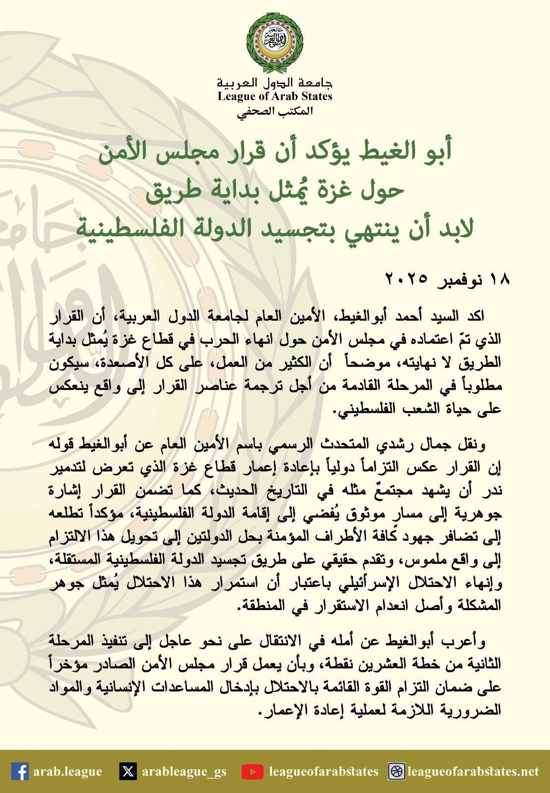 أكد أحمد أبو الغيط الأمين العام لجامعة الدول العربية، أن القرار الذي تم اعتماده في مجلس الأمن حول إنهاء الحرب في قطاع غزة يمثل بداية الطريق لا نهايته، موضحاً أن الكثير من العمل، على كل الأصعدة، سيكون مطلوباً في المرحلة القادمة من أجل ترجمة عناصر القرار إلى واقع ينعكس على حياة الشعب الفلسطيني.