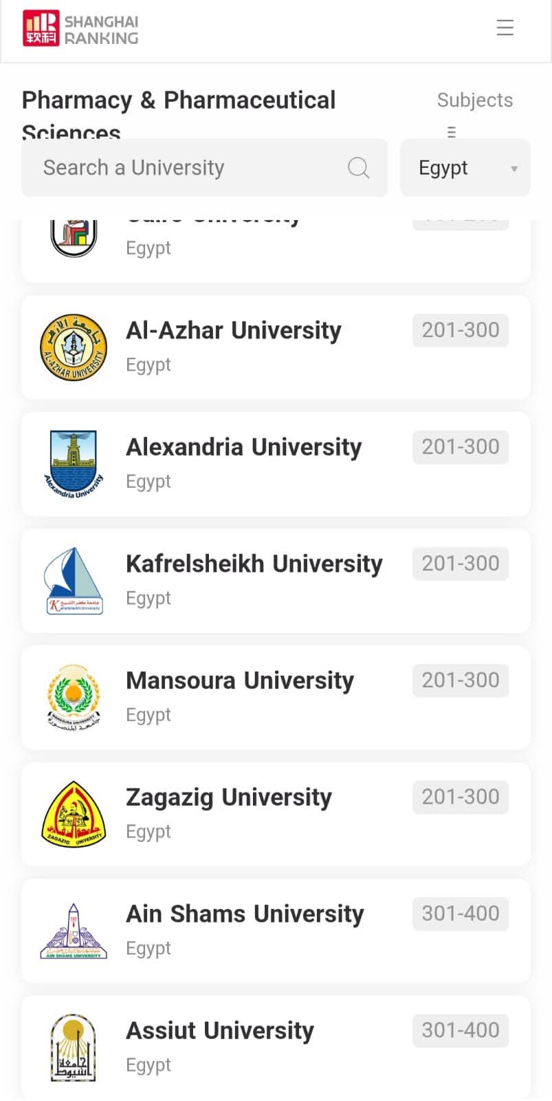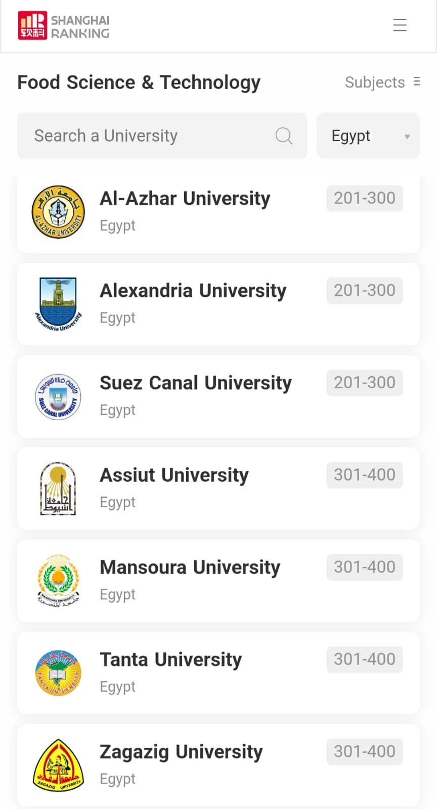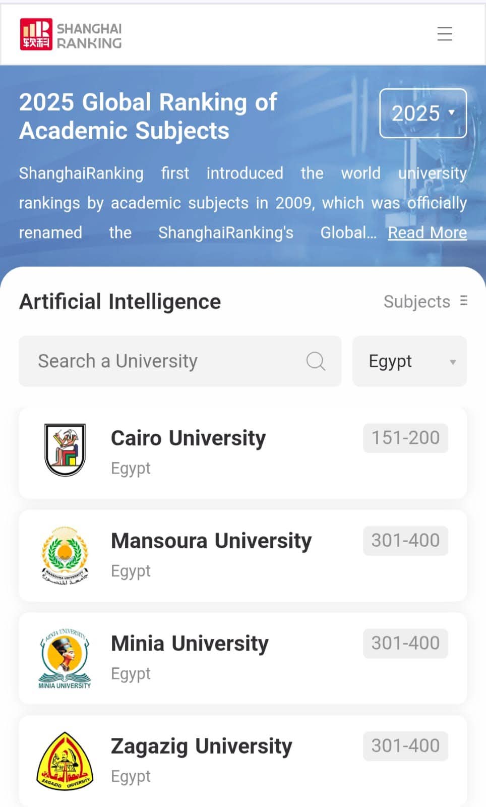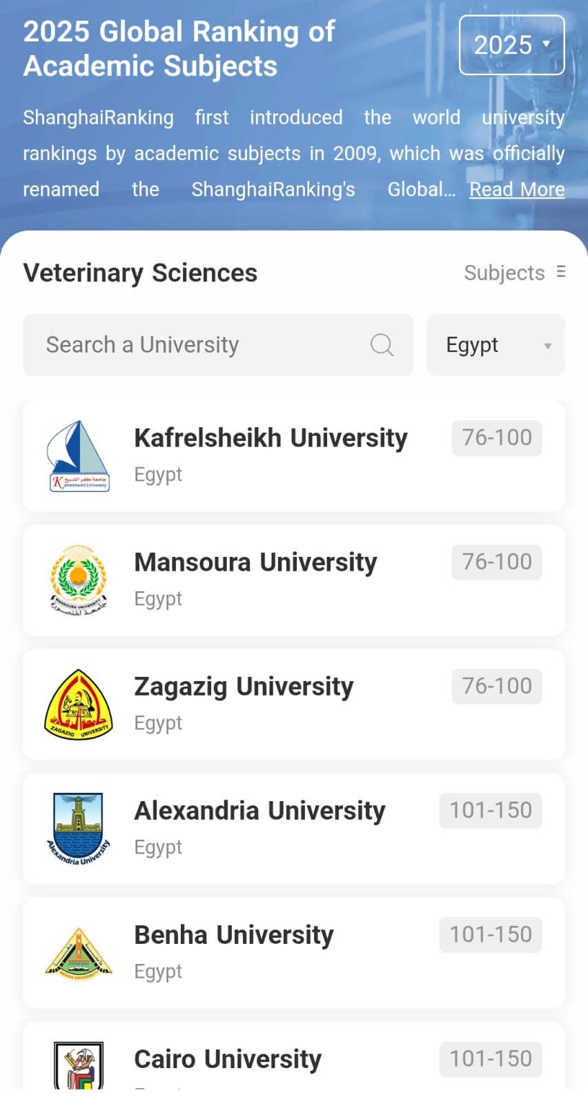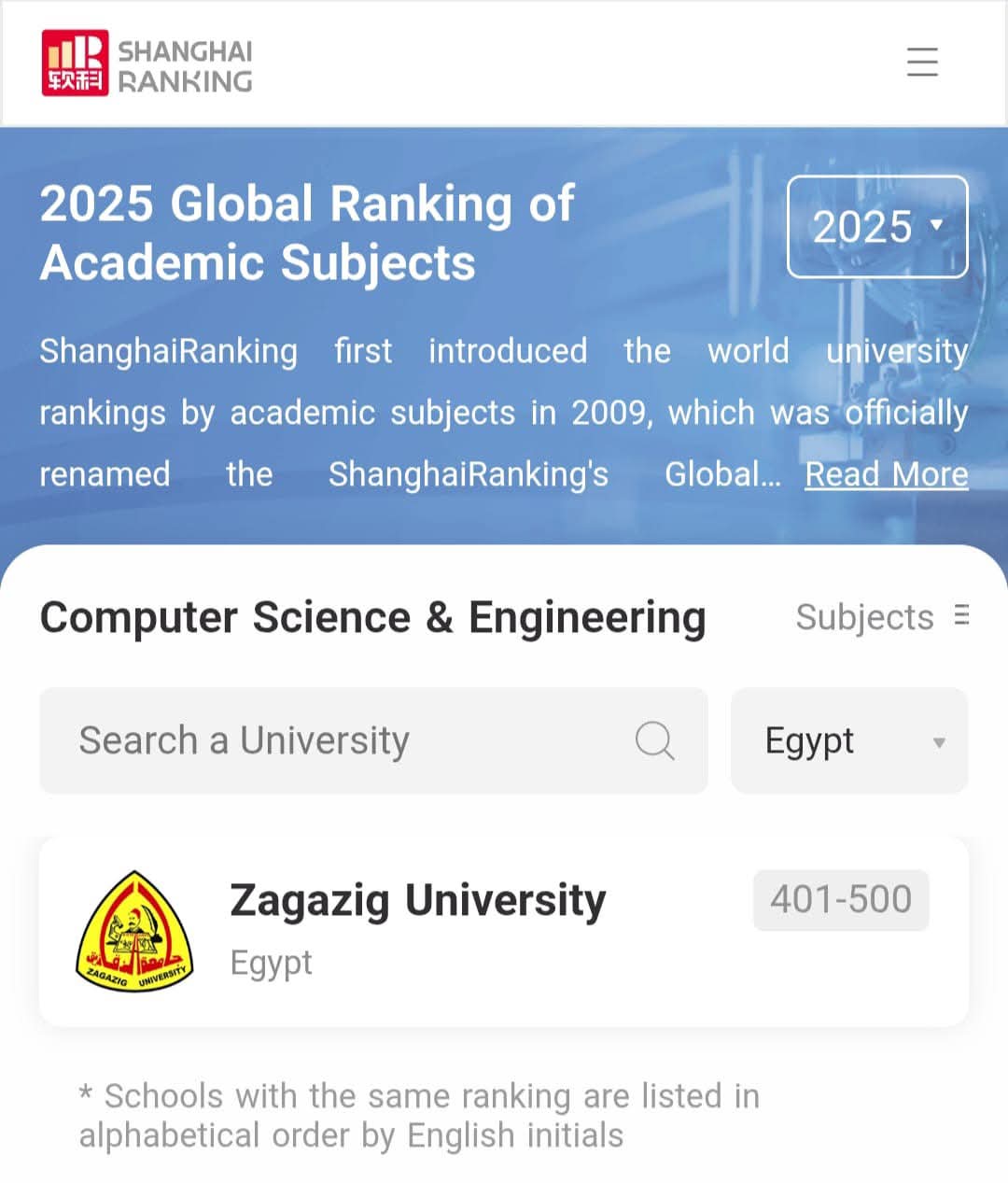 أظهر تصنيف شنغهاي للتخصصات لعام 2025 تقدم جامعة الزقازيق هذا العام في 11 تخصصاً أكاديمياً بزيادة تخصص واحد عن العام الماضي، ضمن التصنيف الذي يشمل ترتيب أفضل 5000 جامعة على مستوى العالم في خمسة مجالات رئيسة تضم العلوم الطبيعية والعلوم الحياتية والعلوم الطبية والعلوم الهندسية والعلوم الاجتماعية.