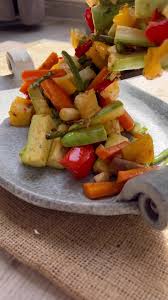 - ضع الصينية في الفرن لمدة 20–25 دقيقة حتى تتحمر الخضار وتصبح طرية من الداخل ومقرمشة من الخارج.
