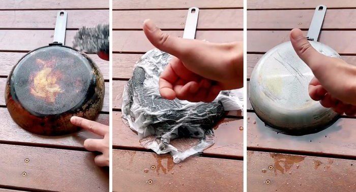 إذا ظهرت بقع داكنة أو بقايا محترقة، يمكن رش كمية من صودا الخبز على الطاسة، ثم إضافة قليل من الماء لتكوين عجينة. تُترك العجينة على البقع لمدة 10 دقائق، ثم تفرك الطاسة بالإسفنجة، وستختفي البقع تدريجيًا.