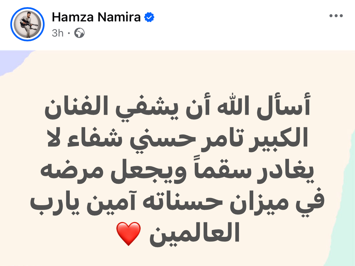 وكتب نمرة عبر حسابه الشخصي بموقع فيسبوك: “أسأل الله أن يشفي الفنان الكبير تامر حسني شفاء لا يغادر سقماً ويجعل مرضه في ميزان حسناته آمين يارب العالمين”.