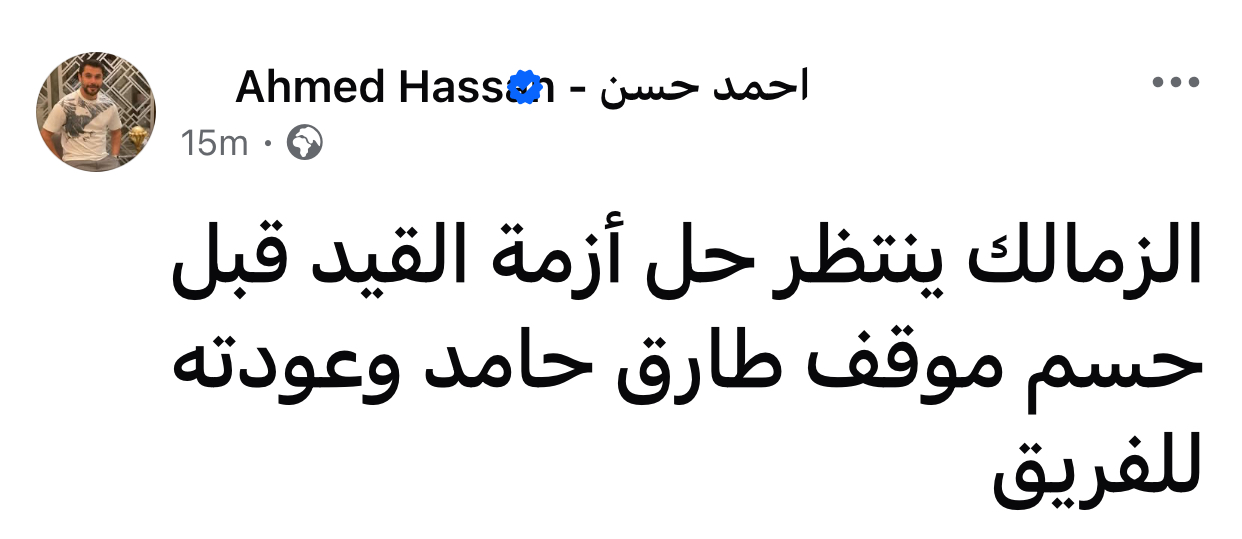 وكتب أحمد حسن عبر حسابه الشخصي بموقع فيسبوك: “الزمالك ينتظر حل أزمة القيد قبل حسم موقف طارق حامد وعودته للفريق”.