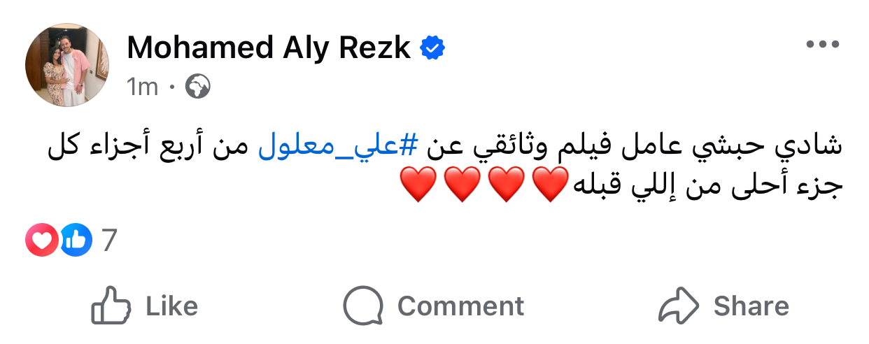 وكتب محمد رزق على حسابه الشخصي بموقع فيسبوك: “شادي حبشي عامل فيلم وثائقي عن علي معلول من أربع أجزاء كل جزء أحلى من إللي قبلها”.