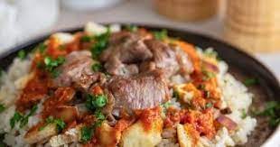 - تُوضع قطع اللحم أو الدجاج في الأعلى، ويُزين الطبق بالمكسرات أو رشة فلفل حسب الرغبة.